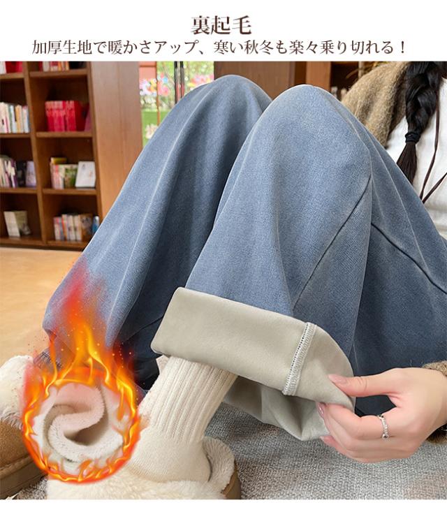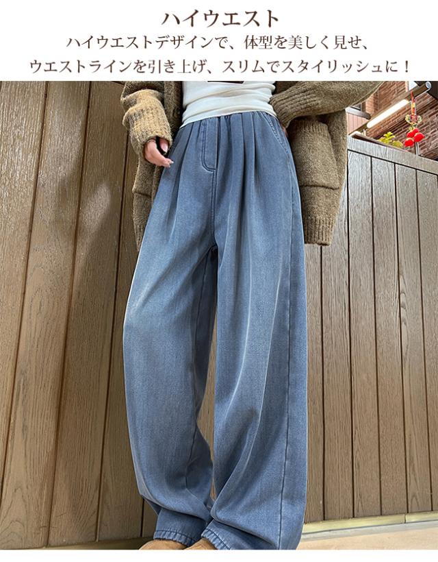 秋新作 裏起毛 デニム 裏ボア ジーンズ ポケット付き パンツ デニムパンツ レディース ワイドパンツ ワイド 体型カバー 脚長効果 動きやすい ジーパン ボトムス ストレート ゆったり ハイウエスト ストレッチ ハイライズ 暖かい 秋 冬