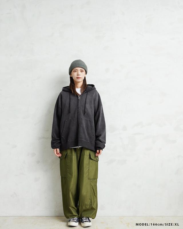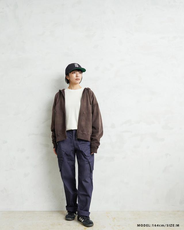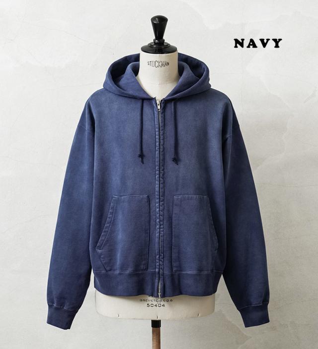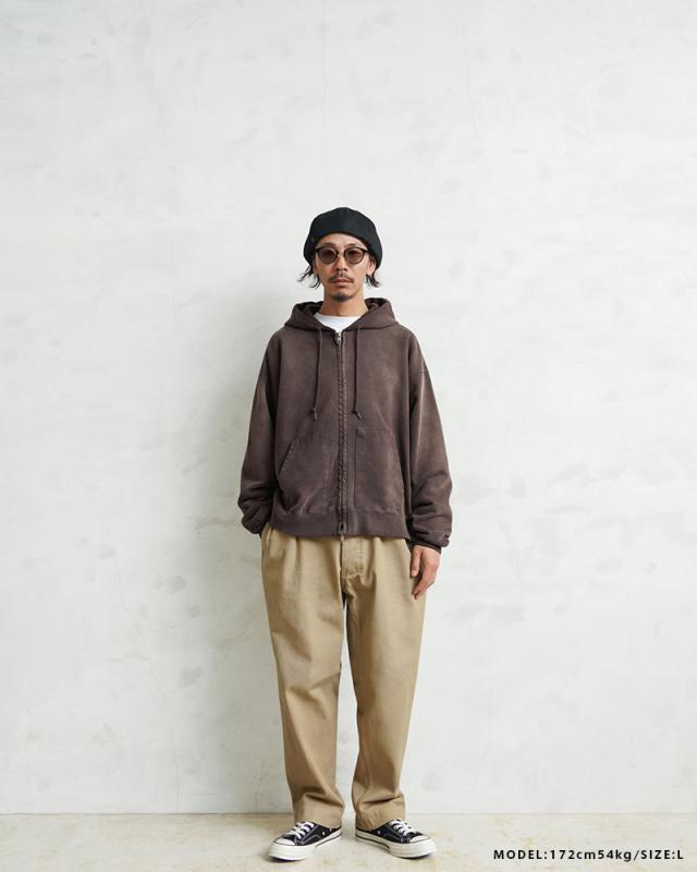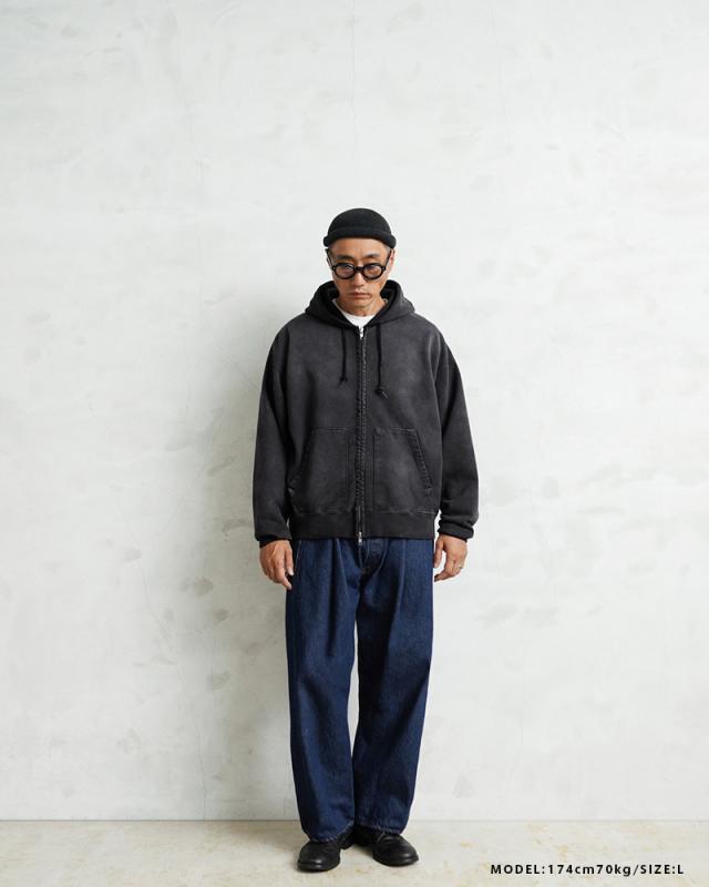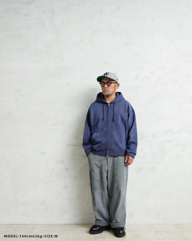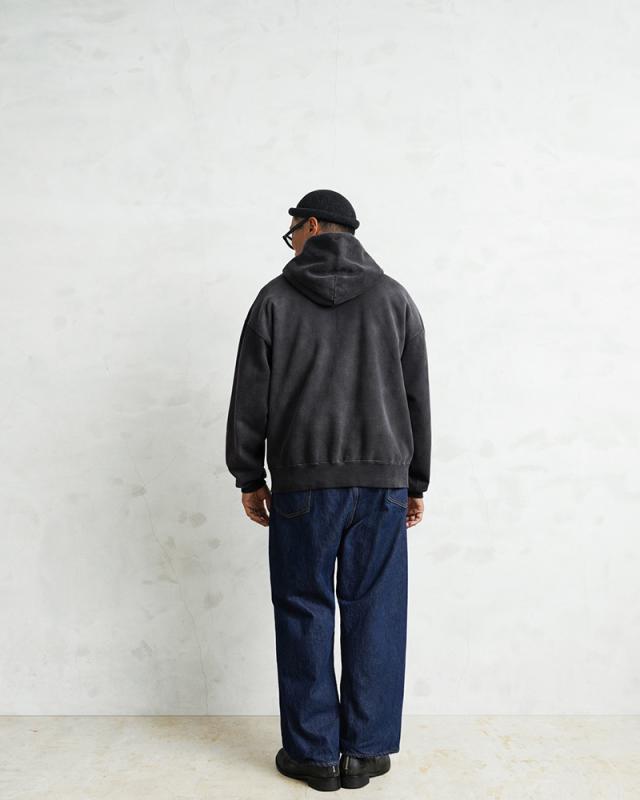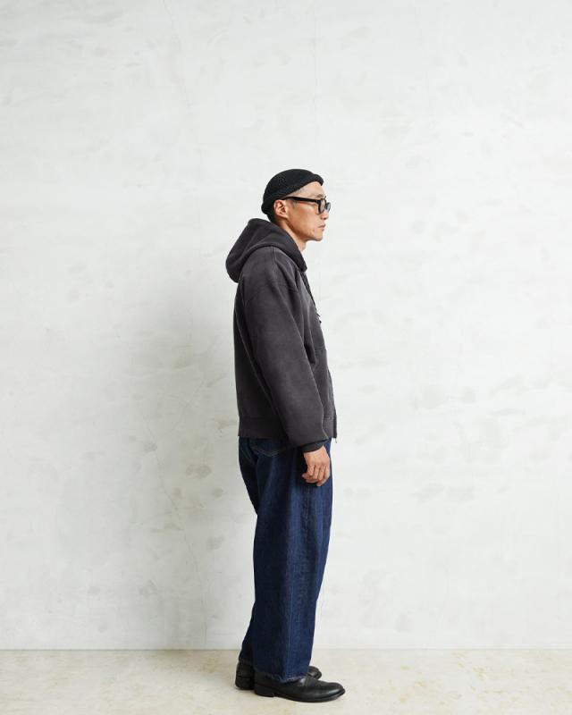 生地には、ヘビーで裏が微起毛したタフなスウェット生地を採用。しっかりとした肉感がありながらも、裏面の微起毛が生み出す柔らかな肌触りで、着込むほどに身体に馴染む仕上がりです。日常使いに耐える耐久性と、快適な着心地を兼ね備えています。