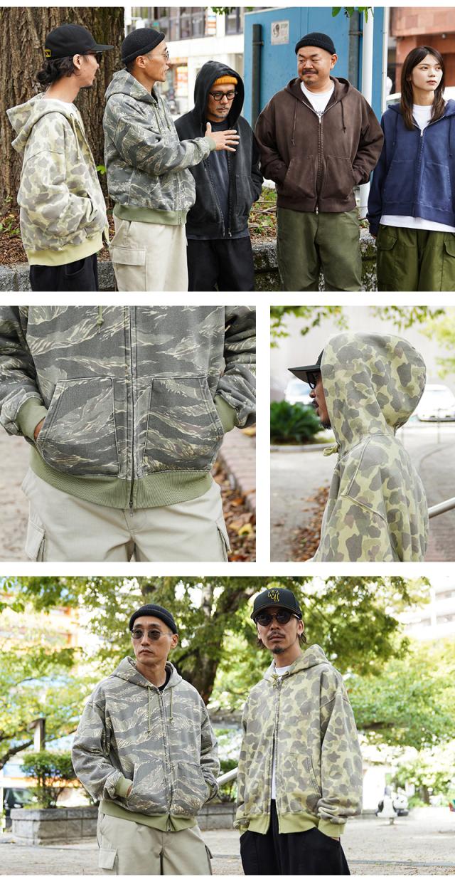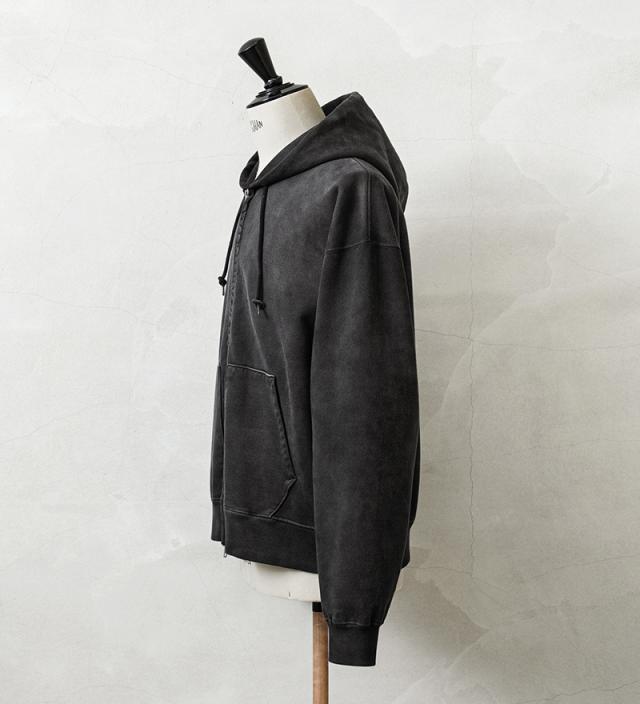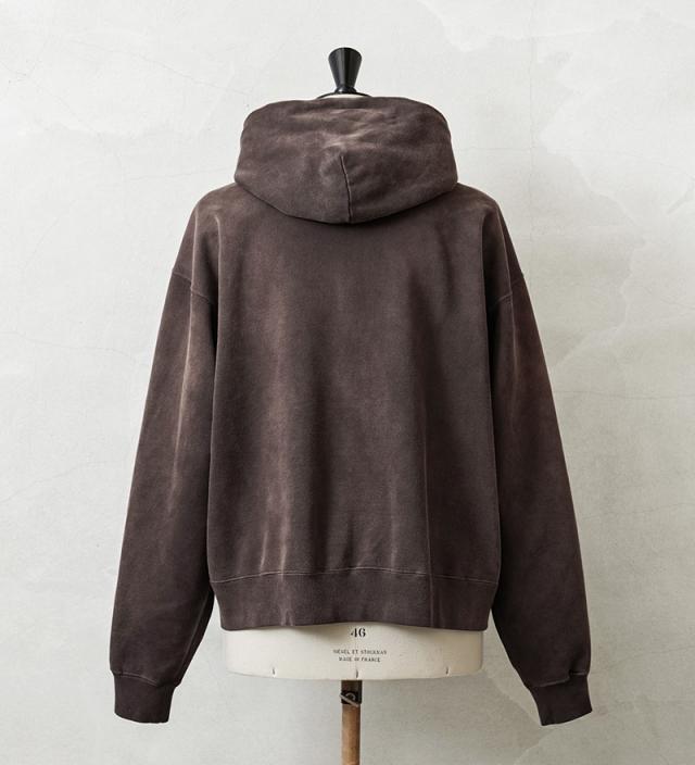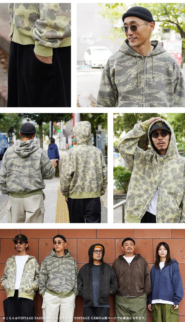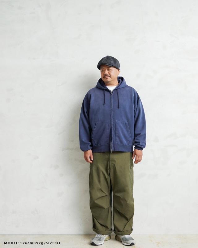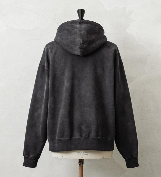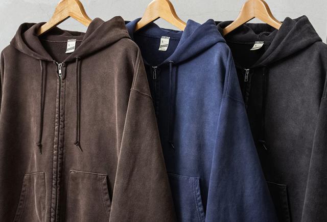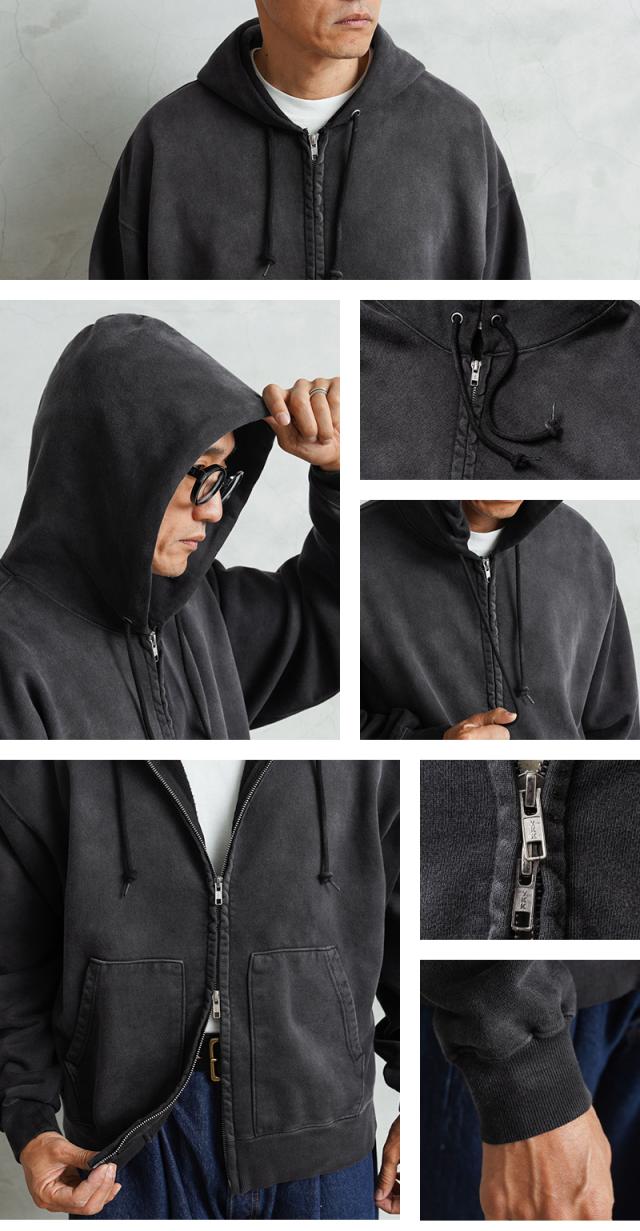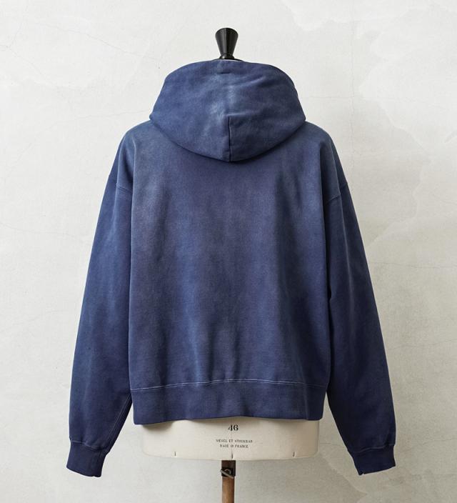 さらに、何度も洗濯と天日干しを繰り返したかのような日焼け加工を施し、長年着込んだような自然な退色感を再現。陽の当たる部分は強く、フード裏や腕の下などの陰になる部分は控えめに加工することで、リアルな経年変化を追求しました。何度もサンプリングを重ね、まるで本物のヴィンテージのような奥行きのある風合いに仕上げています。