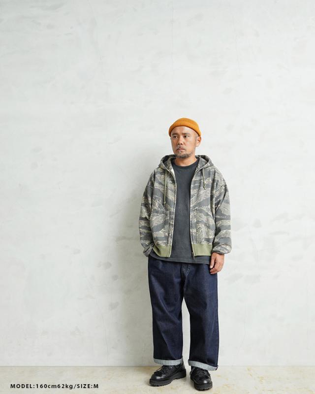 ベトナム戦争期に特殊部隊が愛用した鋭いストライプ柄と、第二次世界大戦期のUSMCで採用されたクラシックな斑点柄——二つの名作カモを融合し、濃度をあえて抑えたフェード感のあるプリントで表現。色を“パキッと”出しすぎず、洗い込んだような柔らかいトーンに調整することで、リアルなヴィンテージの雰囲気を纏わせています。