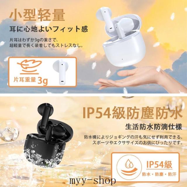 【小型軽量、IP54防水イヤホン】 無線イヤホンとして、片耳の重量は約4g、快適で耳栓のような装着感を提供します。人間工学に基づいた耳入り曲面と角度で耳の形状にぴったりフィットし、脱落しにくい快適な装着感とフィット感を備えています。一日中付けていても耳が痛くならず、最高のオーディオ体験を提供します。耳の小さな方でも無理のない軽快な装着感でご利用いただけます。ワイヤレスヘッドホンのケースはコンパクトで携帯しやすく持ち運びが便利です。さらにランニング・ジムなどスポーツ時の汗での使用に耐える防水、防汗性能で、天候や場所を気にせず音楽を楽しめます。