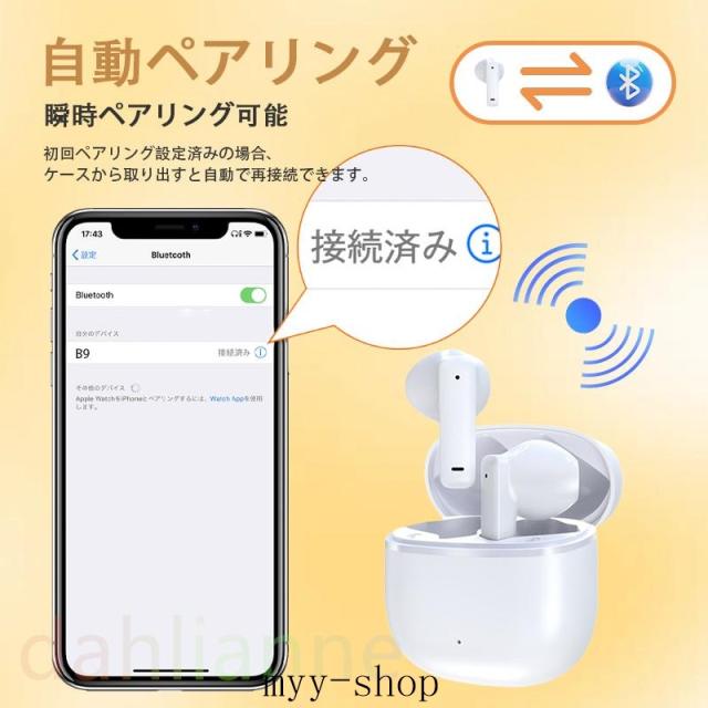 【1ステップで簡単接続、初心者にも簡単操作】 両耳イアホンをケースから取り出して、端末のBluetooth設定画面で「b9」をクリックするだけでペアリング完了!一度接続すれば次回以降はイヤホンを取り出す瞬間に自動接続し、初心者にも簡単に使える完全ワイヤレスイヤホン!ケーブルレスなので動きが制限されないという特性上、イヤホン・ヘッドホン本体側面の物理ボタンは内蔵するリモコンになって、クリックするだけで音楽再生、ボリュームコントロール、曲送り/曲戻し、電話応答やSiriなど、多彩な操作がスマートに行えます。トレーニング、ドライブ、ウォーキングなど日常の様々なシーンで快適に楽しめます。(仕事、通勤・通学、DVD鑑賞、電話会議など)。