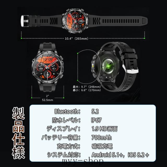 スマートウォッチ【2025新登場 軍用規格 1.9インチ超大画面】iPhone アンドロイド対応 丸型 smart watch 歩数計 活動量計 通話機能付き 100種類運動モード 腕の懐中電灯 耐衝撃 IP67防塵防水 長持ちバッテリー 腕時計 メンズ ギフト 日本語説明書