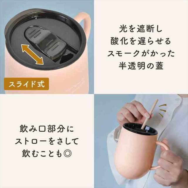 「nosanka」は内側にセラミック加工構造なのでステンレス特有の金属臭はありません。長時間コーヒーなどの飲み物を入れておいても金属特有のニオイがつく心配がなく、コーヒー本来の香りや風味をお楽しみいただけます。また、スポーツドリンクやスープ、炭酸飲料にもご使用いただけます。光を遮断し酸化を遅らせる、スモークがかった半透明の蓋付き。