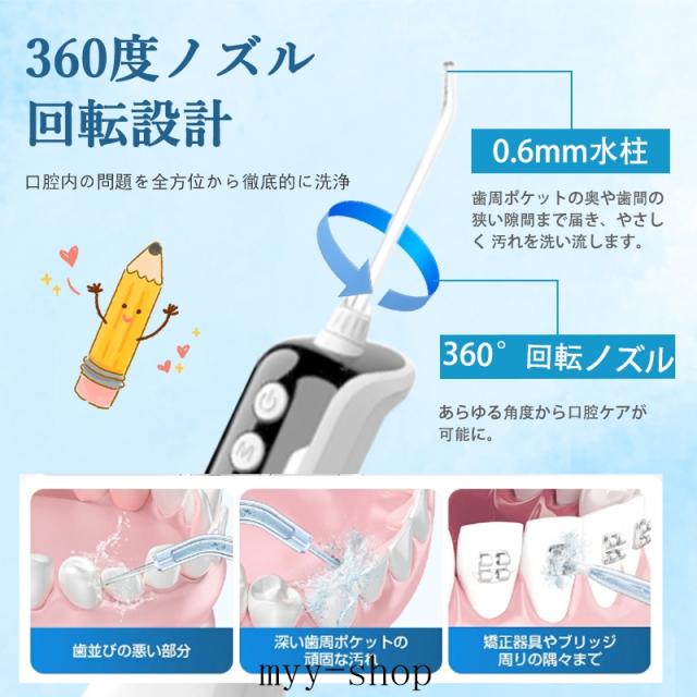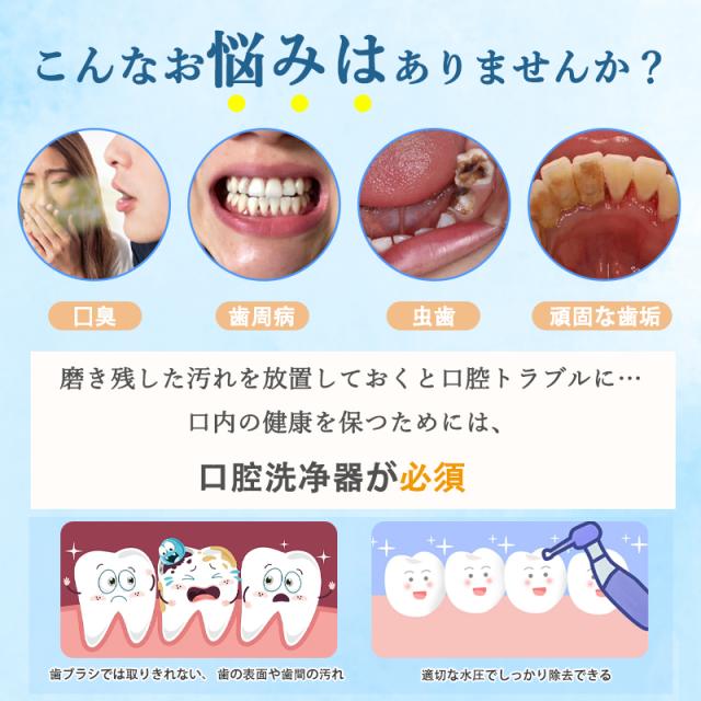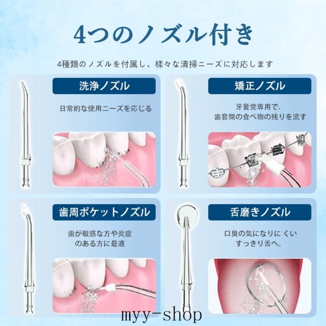 1台多役 、4本ノズル(洗浄ノズル+ソフトノズル+ポイント磨きノズル+舌用ノズル)付き、360°回転ノズル、口腔洗浄器はタンク内に貯めた水を噴射して、口内をキレイになります。ジェット水流で歯の間に詰まった食べかす除去可能です。