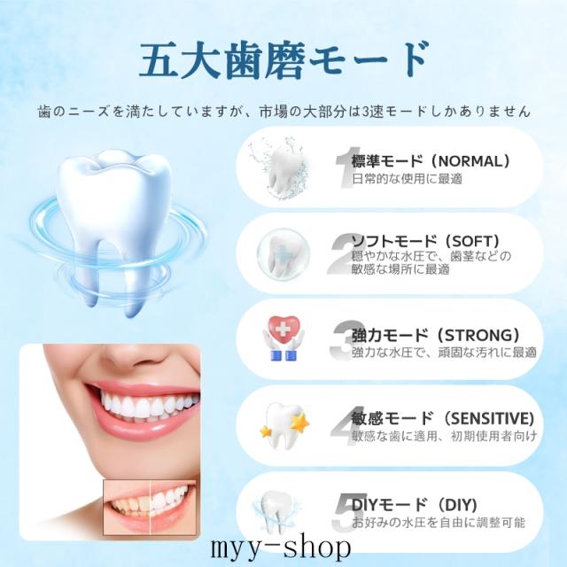独自の超音波水流技術であるスーパージェット水流があり、歯垢除去率は99.9%に達しております。ジェットウォッシャーの振動ジェット周波数は1分間に1300・2400回になり、歯の隙間の汚れを徹底的に取り除き、歯と口を健康に保ち。歯ぐきの状態に合わせて強さが選べる5種類運転モード、5つのモードは、それぞれにPulse、Nornal、Soft、SensitiveとBurstFireです。ワンボタンでご自由に切り替えることができます。各モードは、それぞれに各口腔ケアのニーズを満たすために、各スプレー頻度と水流モードに対応します。 お客様がご自身のお好みによって、適切な水圧モードを選び、もっと快適な口掃除を行いましょう。敏感歯を持つ方々でも適用します。