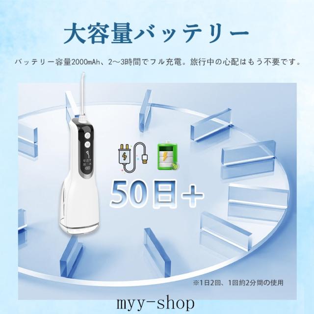 ジェットウォッシャーは2200mAh大容量リチウム電池を内蔵して、3時間で急速充電でき、約50日間連続使用できます。口腔洗浄器のUSB充電方式はいつでもパソコン、車の電源、モバイルバッテリーなどで充電できます。更に口腔洗浄機は収納バッグを付属しており、ご出張やご旅行中に持ち運ぶことができ、その使用体験をアップします。口腔洗浄器はコンパクトなデザインと大容量バッテリーを使いますので、外出時にもっと便利に持ち運びますね!