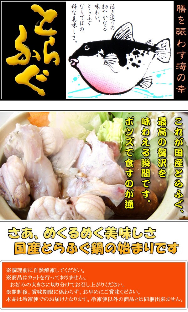 ![]() ![]() 愛知県産の天然とらふぐを活〆、ミガキにしまして瞬間冷凍!鮮度抜群、熟練の職人が処理を行っておりますので安心してお召し上がり頂けます。トラフグのおいしさを再確認できます!1尾入〔約500〜600g前後〕でお届けします。おおよそ2人前の分量となります。そのままぶつ切りでお鍋に!大変簡単に調理できます。商品はカットを行っておりませんのでお好みの大きさに切り分けてお召し上がり下さい。 |