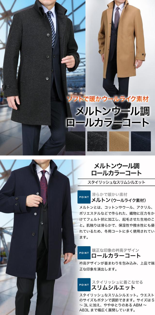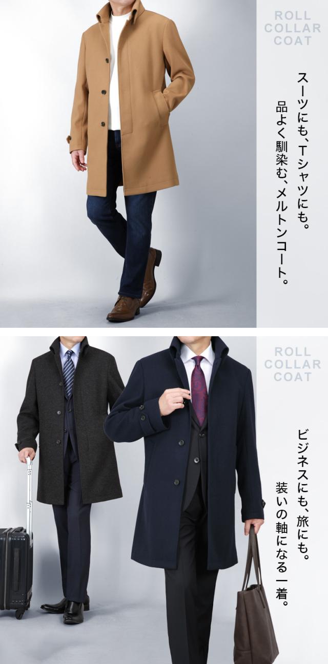 | 【メルトンウールライク素材・ロールカラーコート】 上質なメルトン、ウールライク素材を使用したハーフ丈のロールカラーコート。衿高デザインが首まわりを包み込み、上品で端正な印象を演出します。ソフトで滑らかな肌触りの素材感で、防寒性と軽やかな着心地を両立。スーツスタイルにはもちろん、Tシャツやニットの上から羽織ってもきれいに決まるシルエット。出張や旅行などの移動シーンでもかさばりにくく、オン・オフを問わず活躍します。サイズはS〜3Lに加え、ややゆとりのあるABM〜AB3Lまで幅広く展開。体型や着こなしに合わせて、最適なフィット感をお選びいただけます。冬の装いを上品にまとめる、頼れる一着です。 |