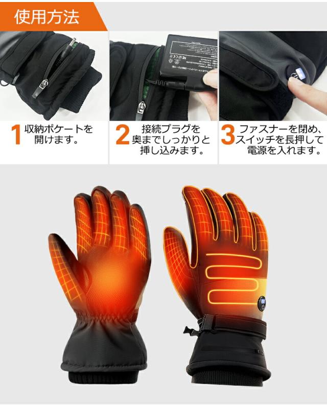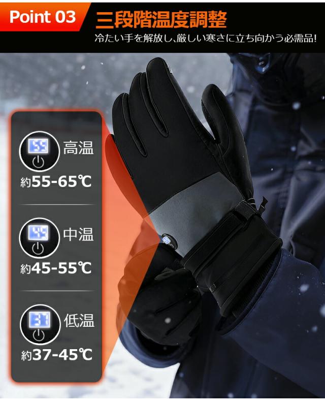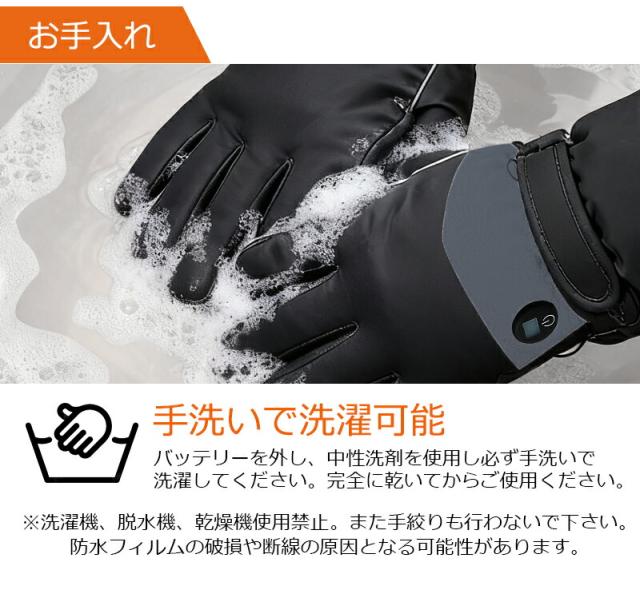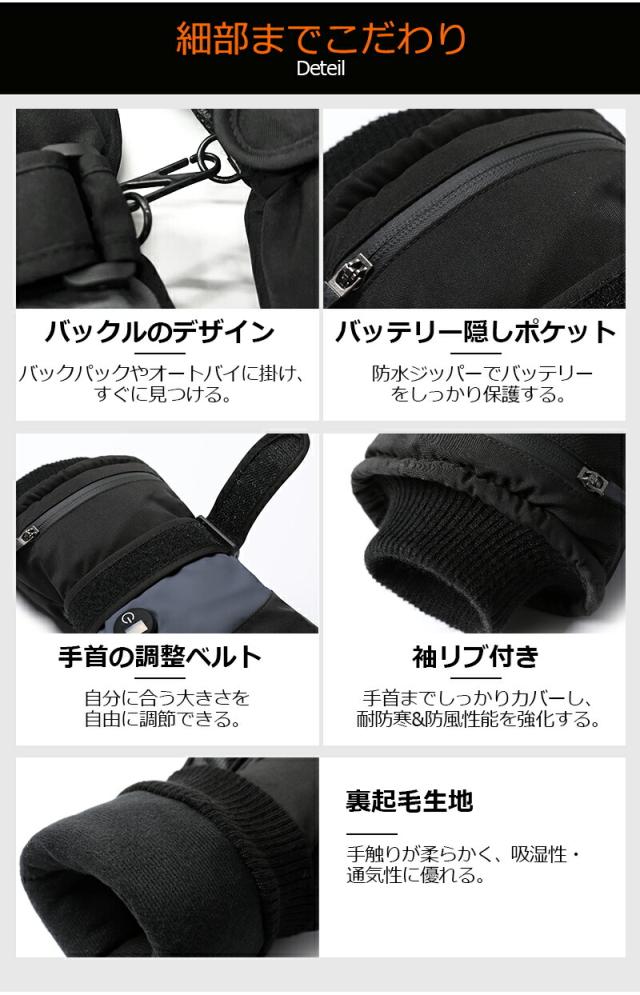 - 裏起毛が肌触り良く、手首のフィット感も抜群。3段階温度調整のボタンが押しやすく、バイク運転中でも操作しやすい。男女兼用で家族で共用できるのも良い。