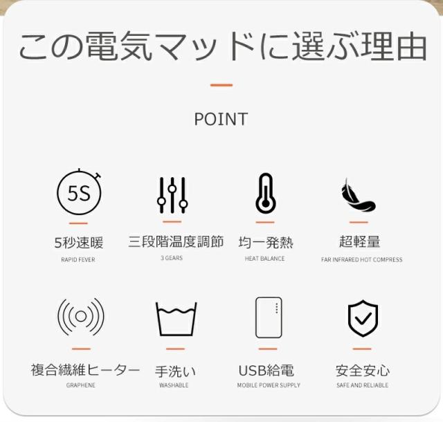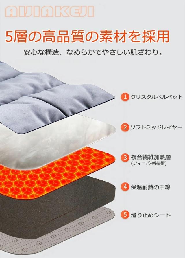 【5秒速暖】ボタンを3秒間押し続けると、加熱が開始され、すぐに熱を感じることができます。これは注目の温熱素材「複合繊維加熱層」内蔵-----熱伝導性に優れている複合繊維を採用しており、遠赤外線の熱エネルギーは5秒で広範囲を均一に加温、急速に暖かくなる。