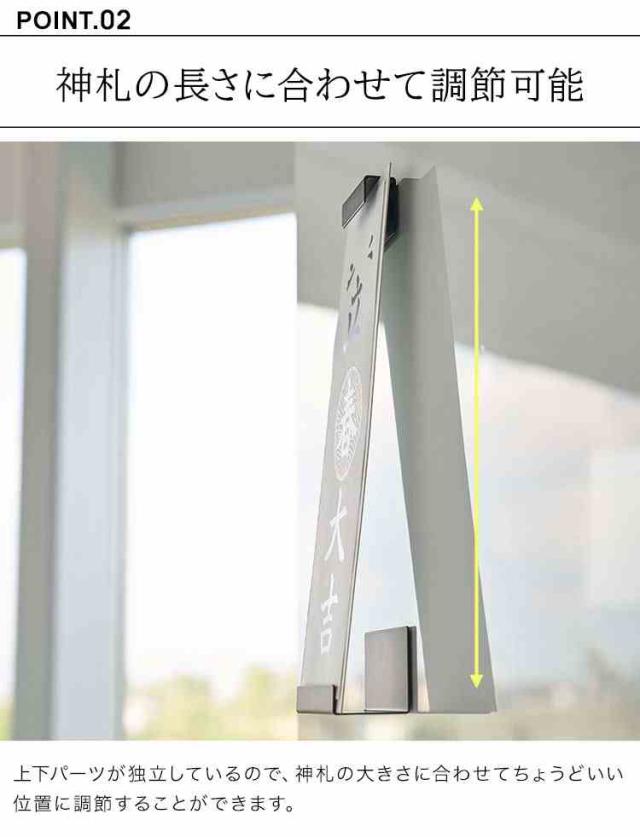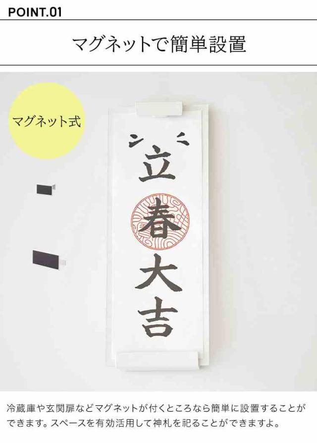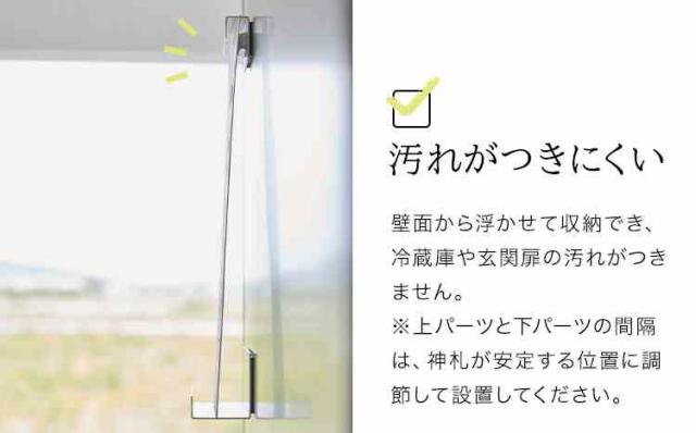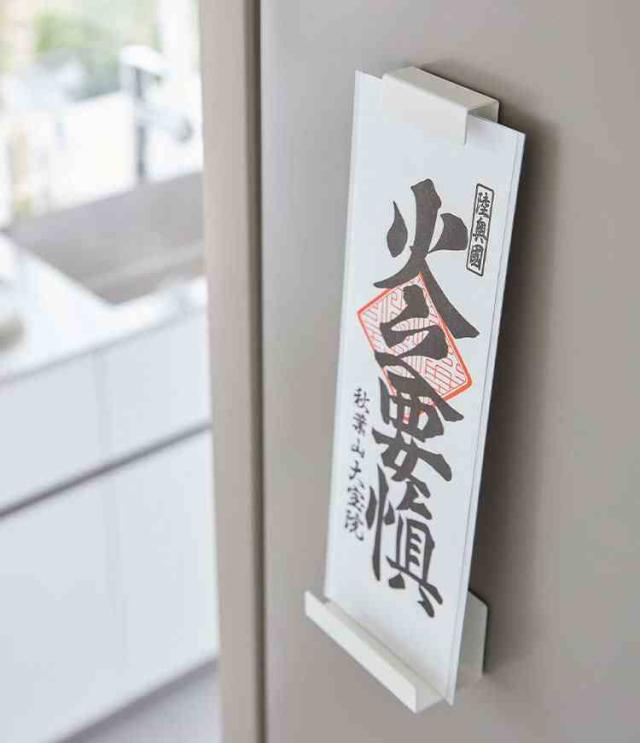 towerのマグネット神札ホルダーシングル。 マグネットでスチール製の玄関扉や冷蔵庫の側面に簡単に取り付けができます。 玄関用の神札や台所用の火の用心の神札の設置にもおすすめです。 神札の長さに合わせてマグネットの位置を調節することができます。 神札を壁から浮かせて収納できるので冷蔵庫や玄関扉の汚れもつきません。