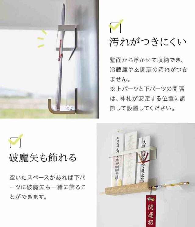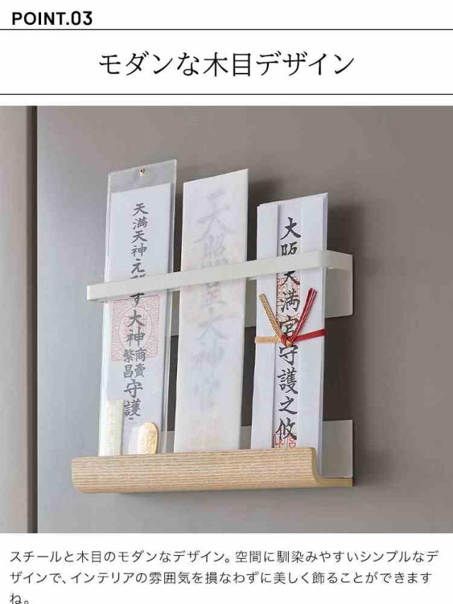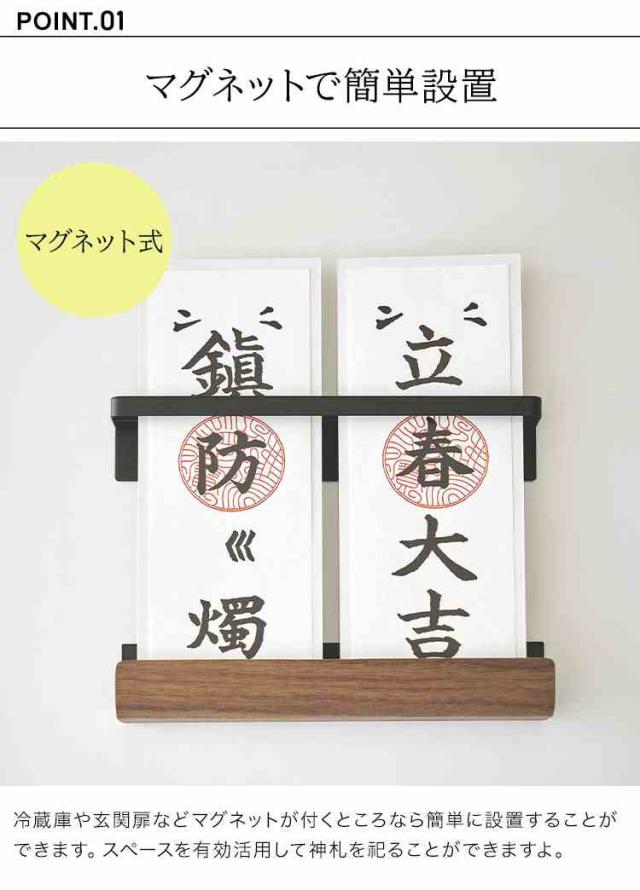 木目が美しいRINのマグネット神札ホルダー。ワイドタイプで複数の神札を立てることができます。破魔矢も一緒に飾れますよ。 マグネットでスチール製の玄関扉や冷蔵庫の側面に簡単に取り付けができます。 玄関用の神札や台所用の火の用心の神札の設置にもおすすめです。 神札の長さに合わせてマグネットの位置を調節することができます。 神札を壁から浮かせて収納できるので冷蔵庫や玄関扉の汚れもつきません。 シンプルでモダンなデザインなのでどんな空間にも溶け込んで神札をスマートに飾ることができます。