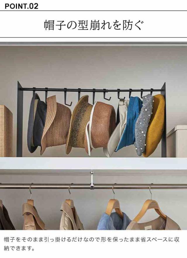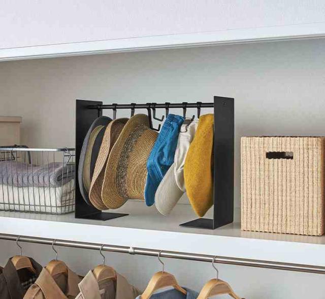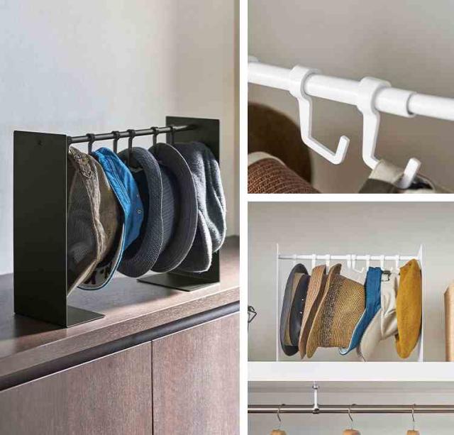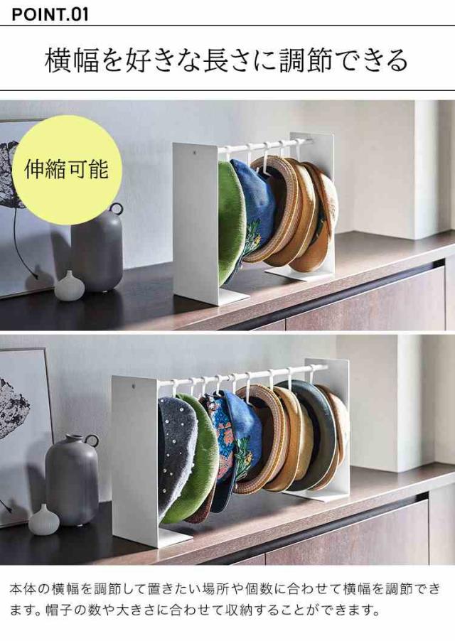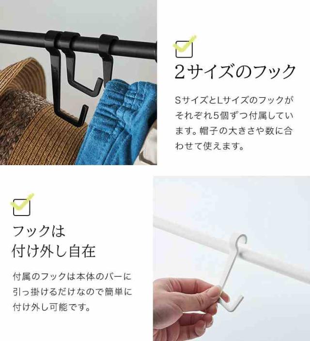 置き場所に困る帽子を掛けて収納。個数や収納場所に合わせて横幅を調節できる帽子収納スタンドです。帽子を掛けて収納できるので、帽子の型くずれを防ぎ、目当ての帽子をサッと取り出すことができます。帽子は最大10個収納可能。掛けておけるので型くずれを防ぎます。置きたい場所や個数に合わせて伸縮可能です。付属のフックがSとLの2サイズ付いていて、帽子に合わせて使い分けできます。フックはお好みの位置に取り付け可能です。