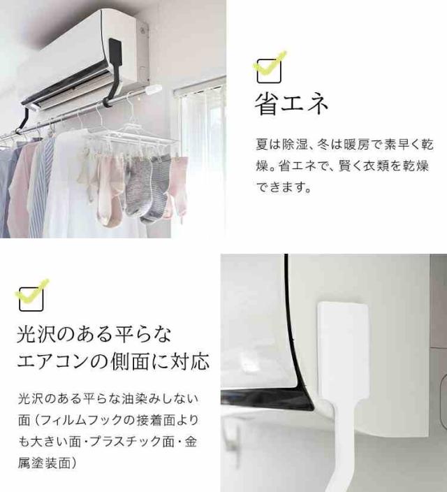 エアコンの風を直接当てて、洗濯物を効率よく乾かすことができる室内物干しポールホルダー。お手持ちの竿やポールを掛けて、洗濯物の干しスペースとして活用できます。夏は除湿、冬は暖房で素早く乾燥。省エネで、賢く衣類を乾燥できます。エアコンの両側面にフィルムフックで簡単取り付け。光沢のある平らなエアコンの側面に対応しています。