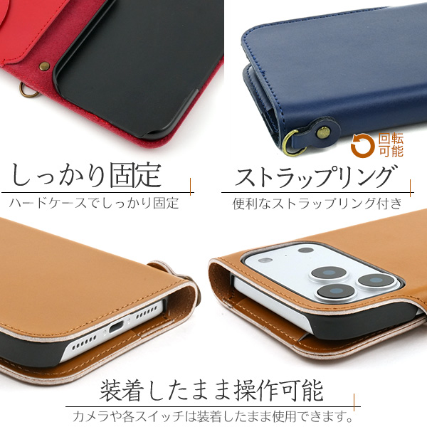 | 上質な牛革を全面に使用した、牛革手帳型ケース。 美しい質感と滑らかな触り心地の牛革を使用しています。 一つ一つ丁寧に制作しています。 実用新案登録済のカード落下防止フラップ付き! 逆さにしてもカード落下の心配がありません。 大切なカード収納時やネックストラップ使用時などに最適です。 内部ケースはハードケースなのでしっかりとスマートフォンを固定できます。 横開きタイプなので、手帳のように使うことができます。 また、内側にはカードポケット2つとフロント/サイドポケットが付いています。 しっかりと固定できるマグネット式スナップボタンを採用しています。 便利なストラップリング付きで、ストラップなどを装着可能です。 | ||||||||||||||