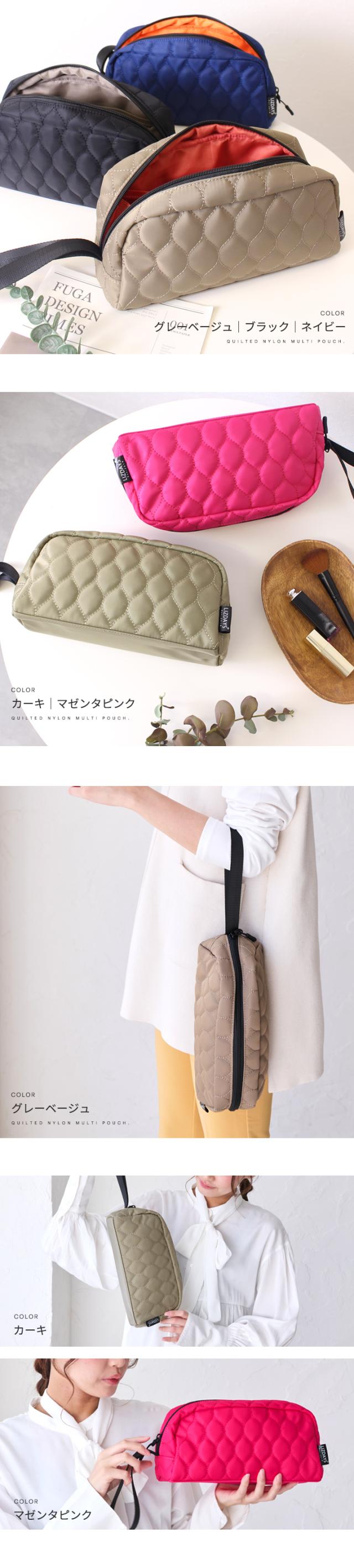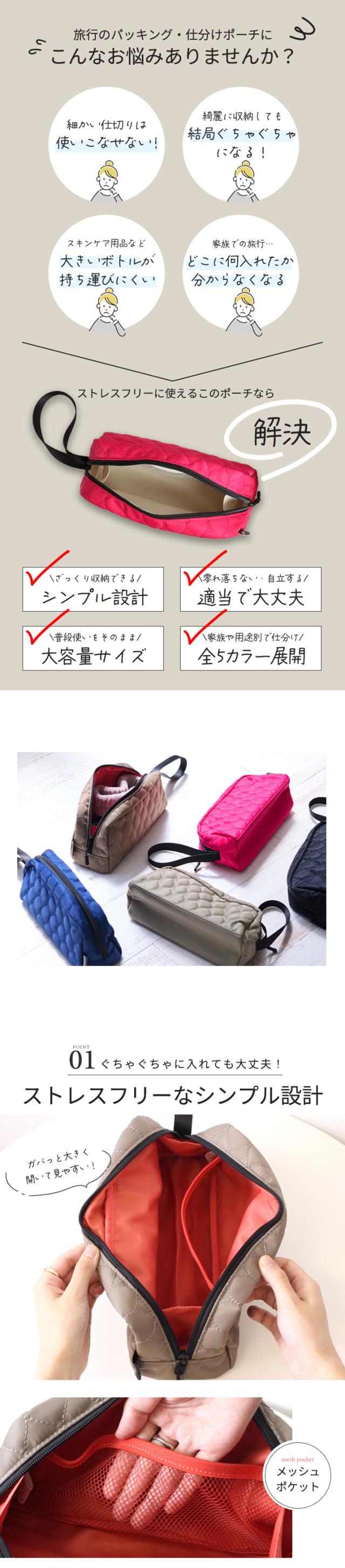仕切り付きや整理整頓できるポーチもいいけれど ぐちゃぐちゃっと収納しても大丈夫なポーチなら 綺麗に入れることにイライラしたり… 綺麗に入れても後々散らかることにストレスを感じたり… そんな気持ちから解放してくれます! 内側にはメッシュポケット1つとシンプルな設計。 トラベルサイズじゃないものも入るよう大容量! 長めの持ち手付きでドアノブやフックにかけたり 置き場がない化粧室でもリップが塗りなおせたり とっても便利に活用できます! 撥水で軽量なナイロン生地を使用し、内側の色 とのコンビネーションにもこだわりました。 家族別や用途ごとの使い分けもおすすめです。 |