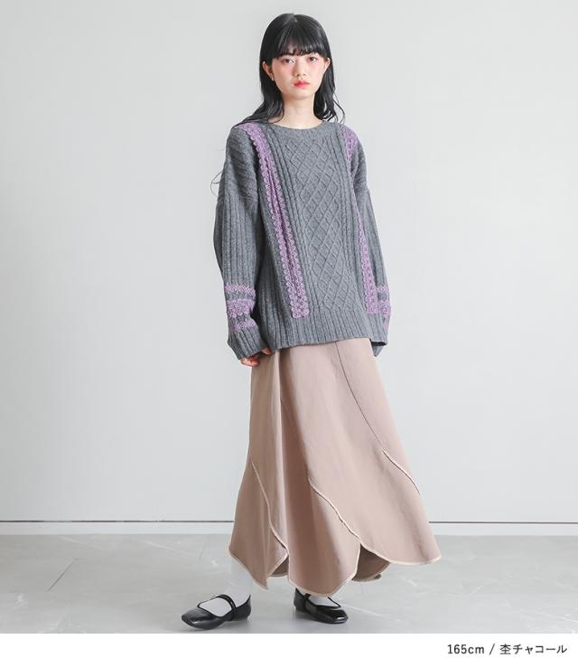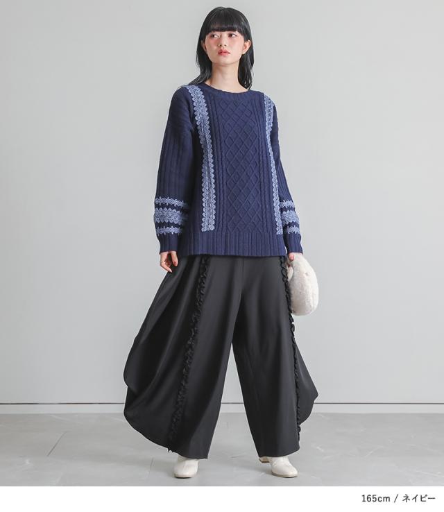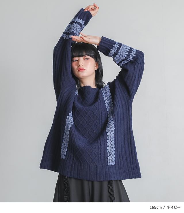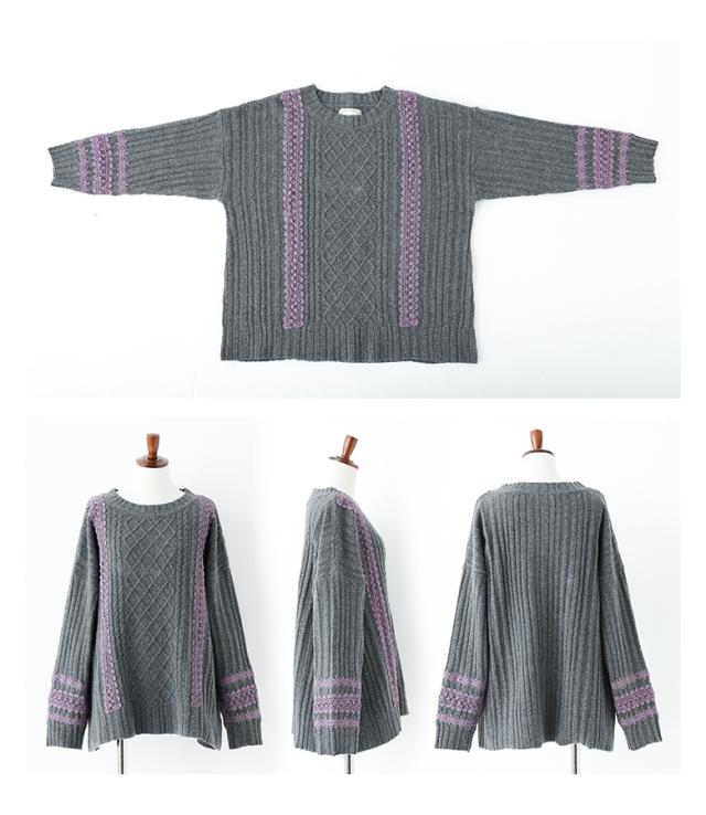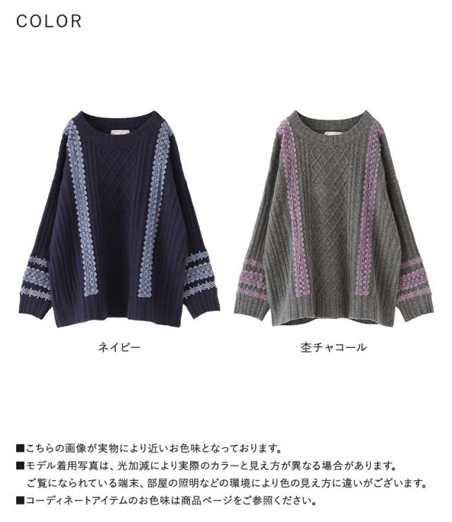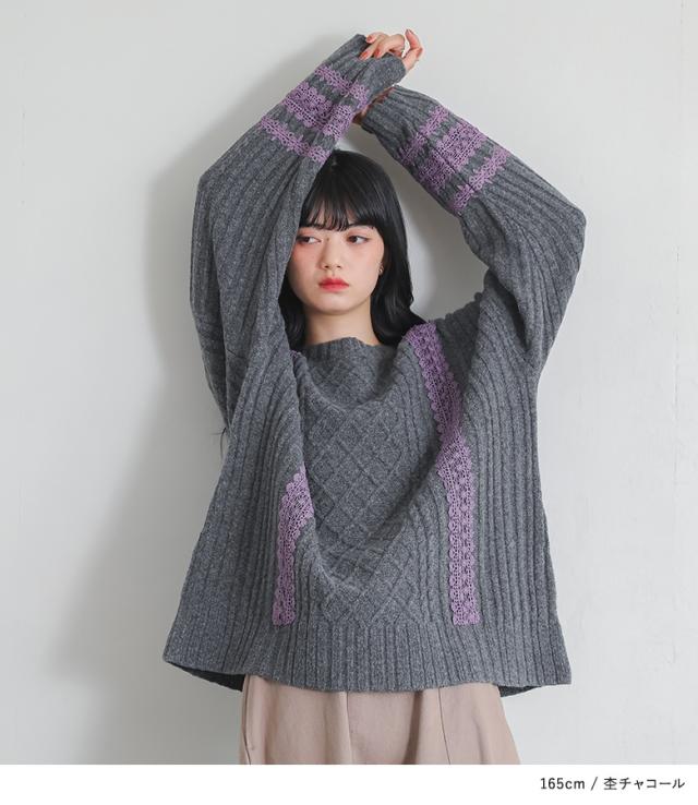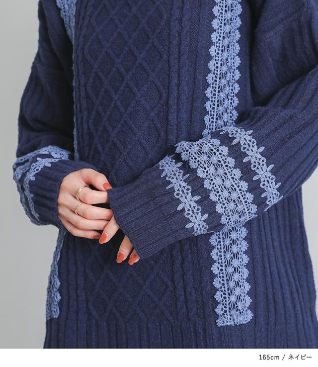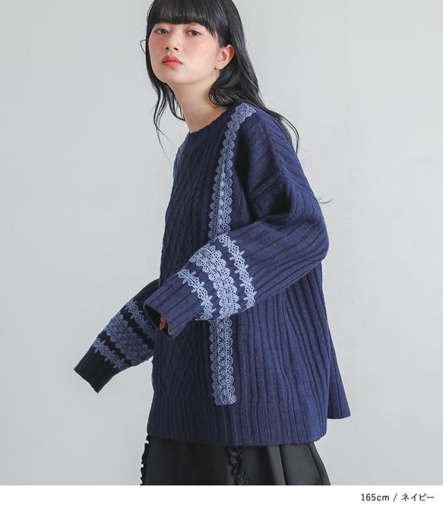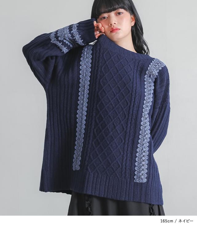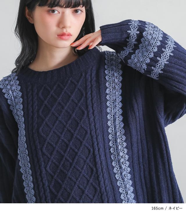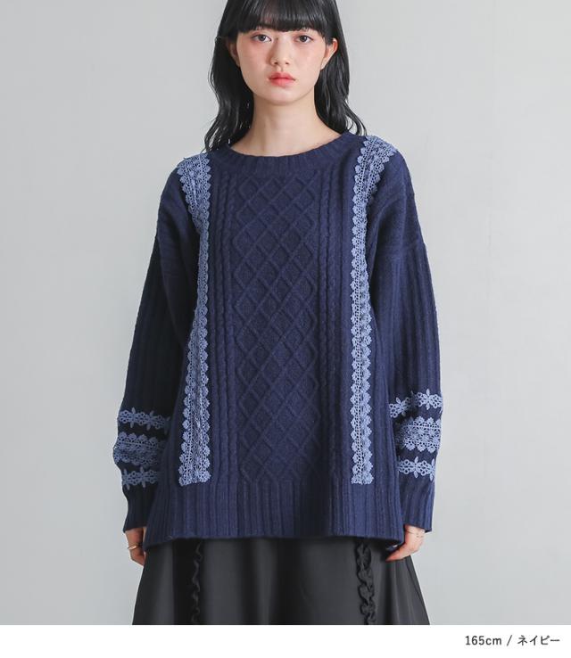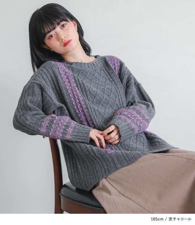 <冬新作>『レースデザインモヘヤタッチケーブルニット』【メール便不可】【20】[ニット 長袖 レディース トップス セーター クルーネック モヘヤタッチ ケーブル編み リブニット レース 秋 冬]