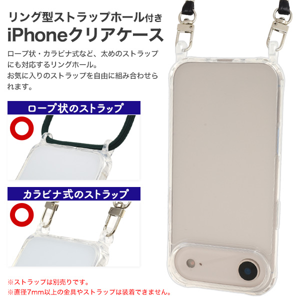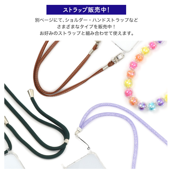 お好みのストラップと合わせて使えるリング型ストラップホール付きのクリアケースです。