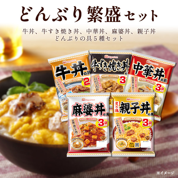 牛丼の具 2食、牛すき焼き丼の具 3食、中華丼の具 3食、麻婆丼の具 3食、親子丼の具 3食