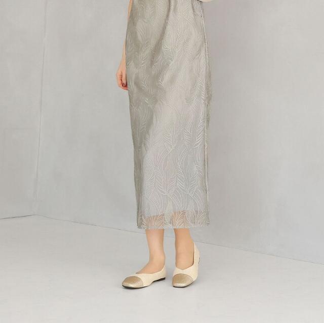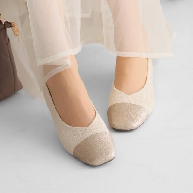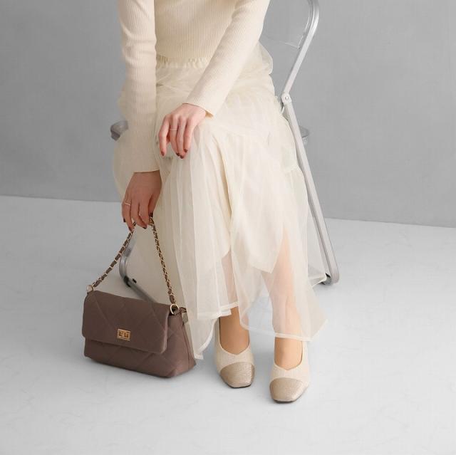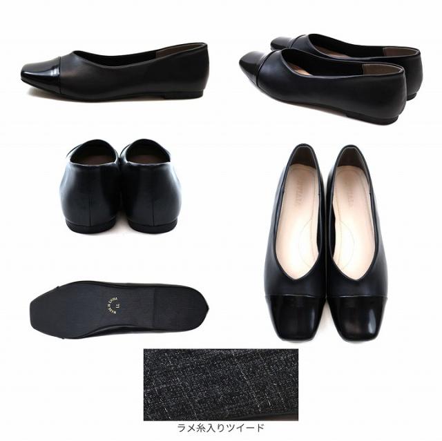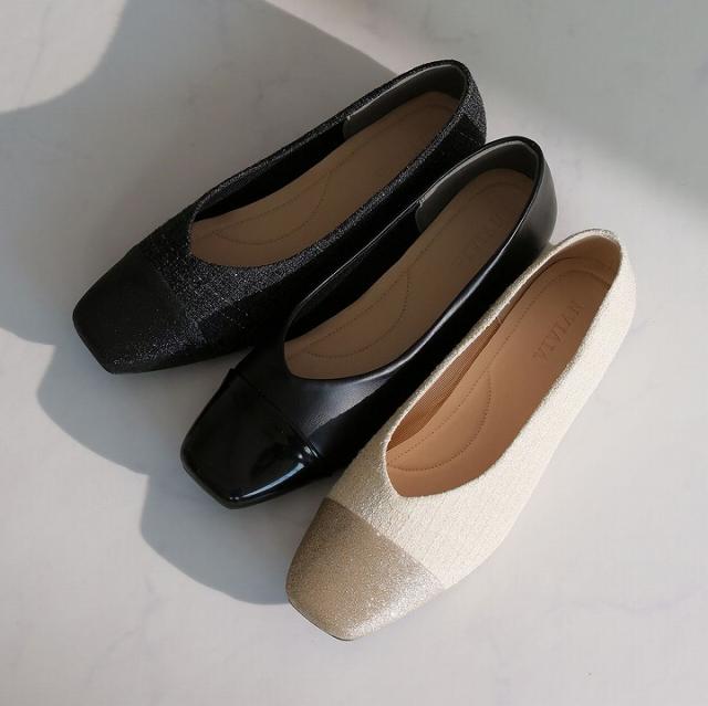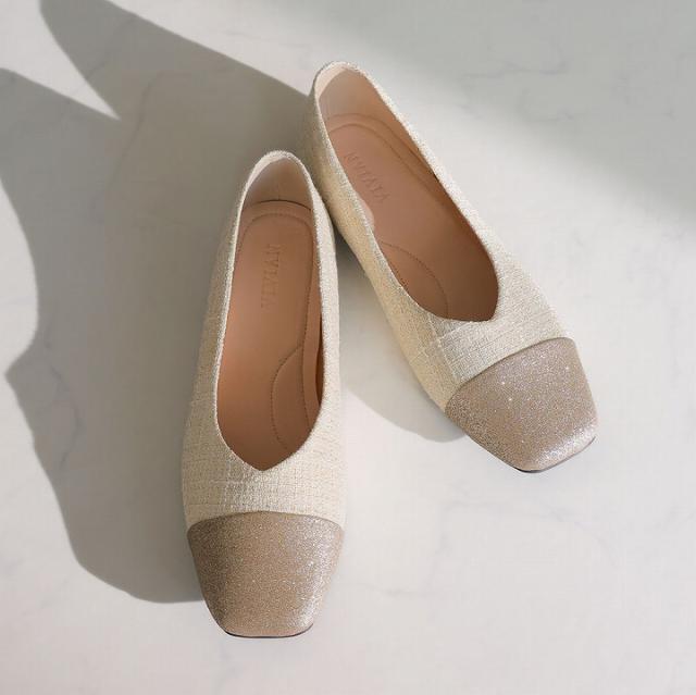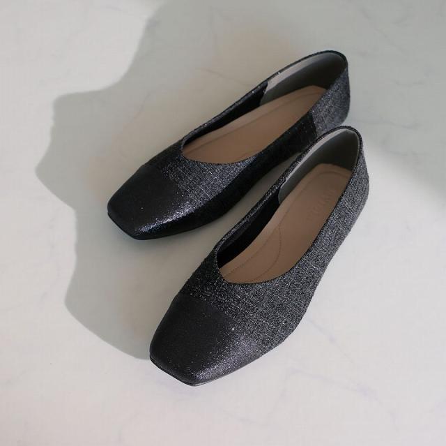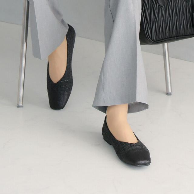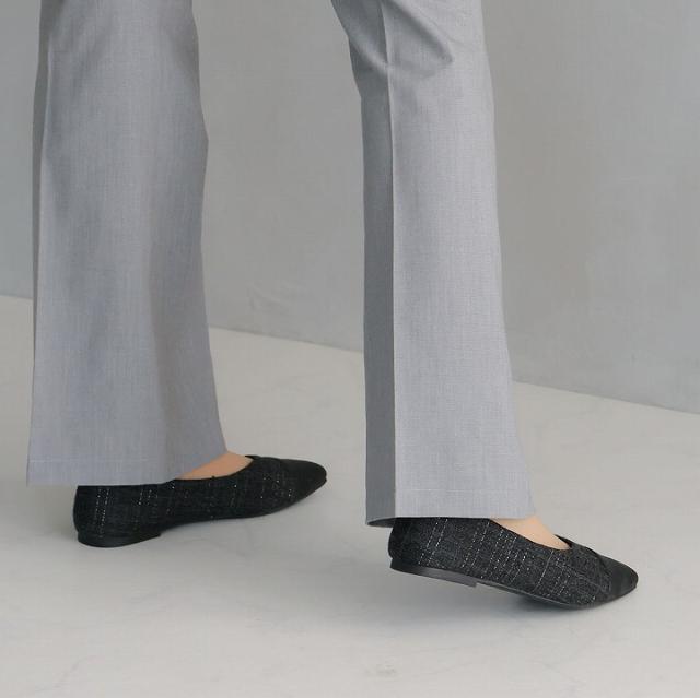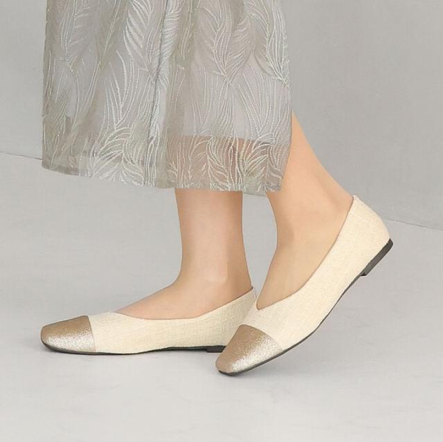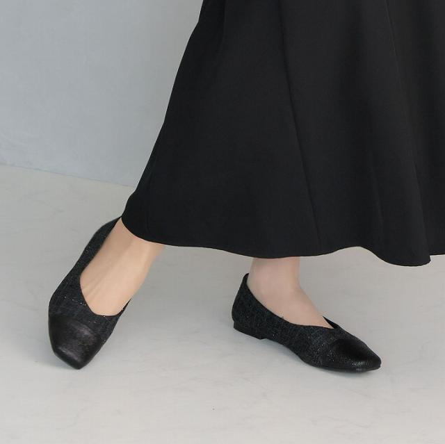 キラキラのグリッター×上品なラメ糸入りツイードがアクセサリー感覚で履ける!異素材の切り替えデザインがポイントのフラットパンプス!