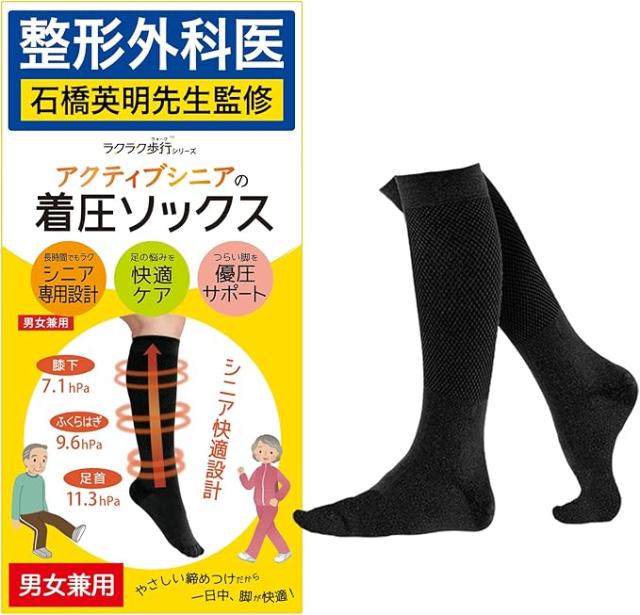 【ラクラク歩行(ウォーク)アクティブシニアの着圧ソックス】はシニア専用の設計仕上げた着圧ソックスです。下から上への流れを作る【段階式着圧設計】。シニアにとって大切な筋肉をサポートし、思い気持ちをスッキリ、軽やかな脚に。独自シニア専用設計の加圧構造で、通常の着圧ソックスよりも優しく、かつ徹底アプローチ。※このページは【膝下つま先ありタイプ】になります。