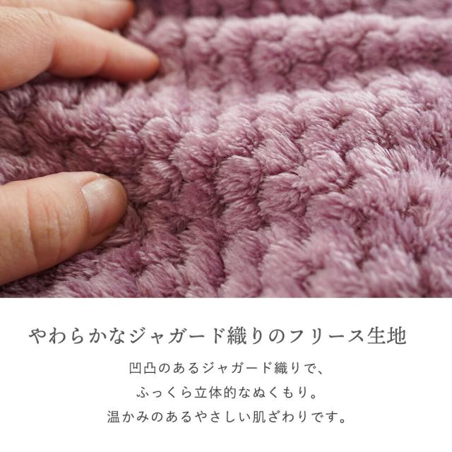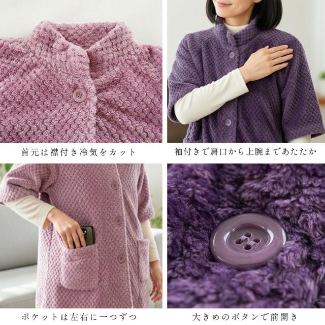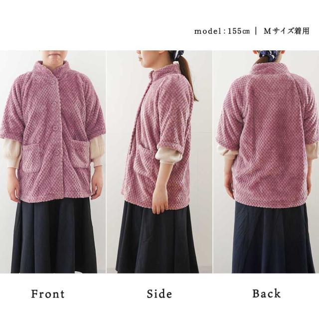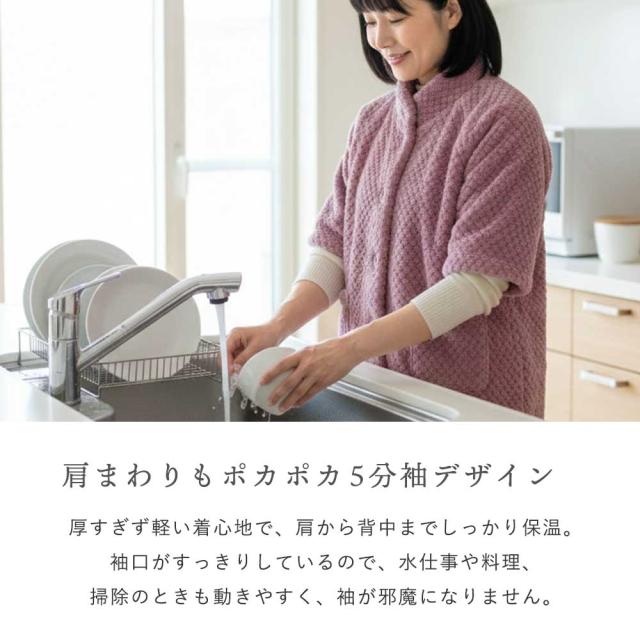 ・やわらかなジャガード織りのフリース生地 凹凸のあるジャガード織りで、ふっくら立体的なぬくもり。温かみのあるやさしい肌ざわりです。 ・肩まわりもポカポカ5分袖デザイン厚すぎず軽い着心地で、肩から背中までしっかり保温。袖口がすっきりしているので、水仕事や料理、掃除のときも動きやすく、袖が邪魔になりません。 |