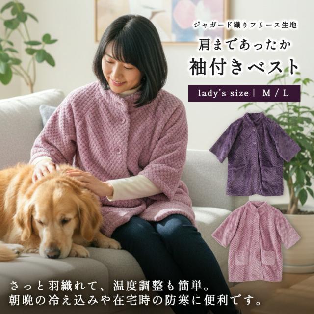 [keyword | ジャガード織り フリース あったか 袖付き ベスト レディース 婦人 M L ジャガード ボア 袖あり チョッキ 冬 防寒 羽織 部屋着 室内 ルームウェア プレゼント ギフト シニア 節電 無地 ]