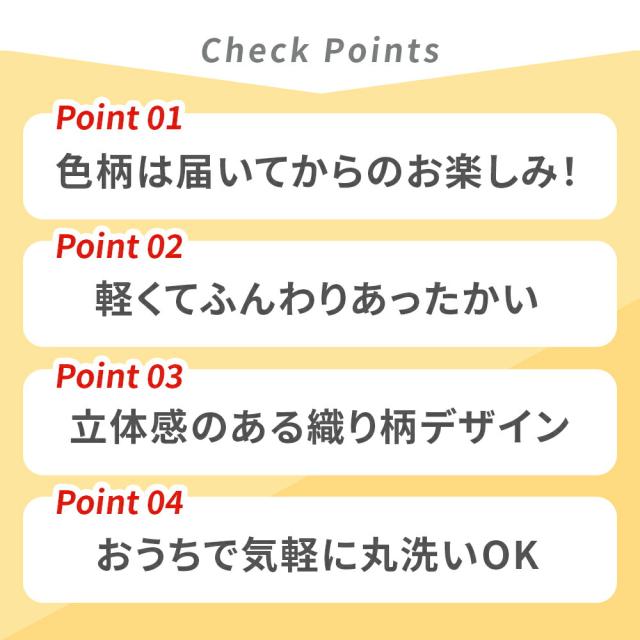 ・色柄は届いてからのお楽しみ! 色柄はおまかせにすることで生地にかかるコストや柄の仕分け作業にかかるコストをカットすることによりお求めやすい価格設定にすることができました! ・軽くてふんわりあったかい長めの毛足が空気を含み、ふんわりあたたか。軽くて柔らかく、体にやさしく寄り添います。秋口〜春先までロングシーズン活躍するブランケットです。 ・立体感のある織り柄デザイン糸で柄を織り上げたジャガード仕立て。プリントでは出せない凹凸のあるデザインが魅力です。 ・洗濯機で手軽に洗える乾きやすいポリエステル素材だから冬のお洗濯も安心。ご家庭で丸洗いできて、毎日清潔にお使いいただけます。 |