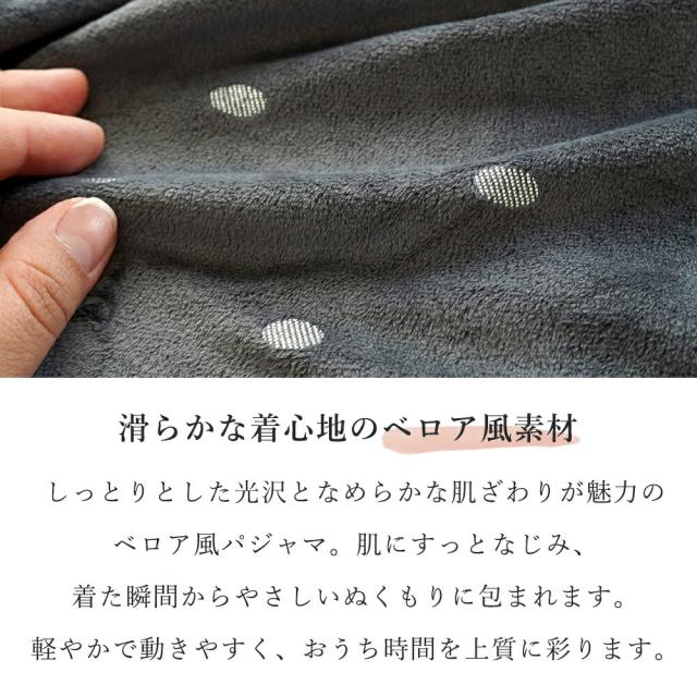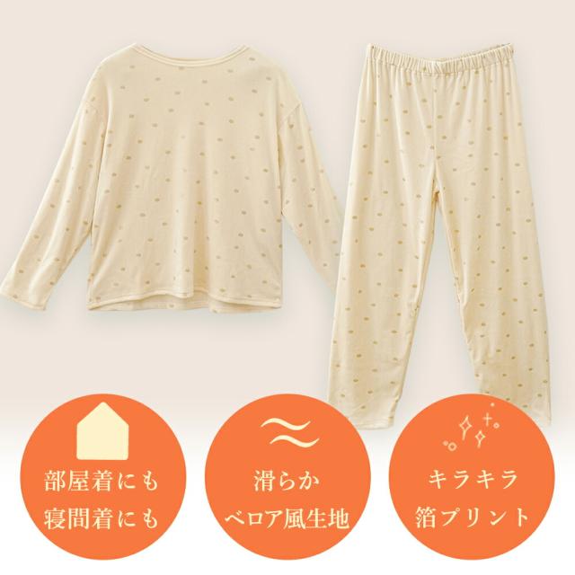 暖か ベロア風 パジャマ レディース なめらか 箔押し ドット柄 かわいい 長袖長ズボン 上下セット 丸首 かぶり 長袖 長ズボン ふんわり 軽い ゆったり ぽか活 カジュアル シンプル 婦人 M L 冬 セットアップ 節電 joliespase