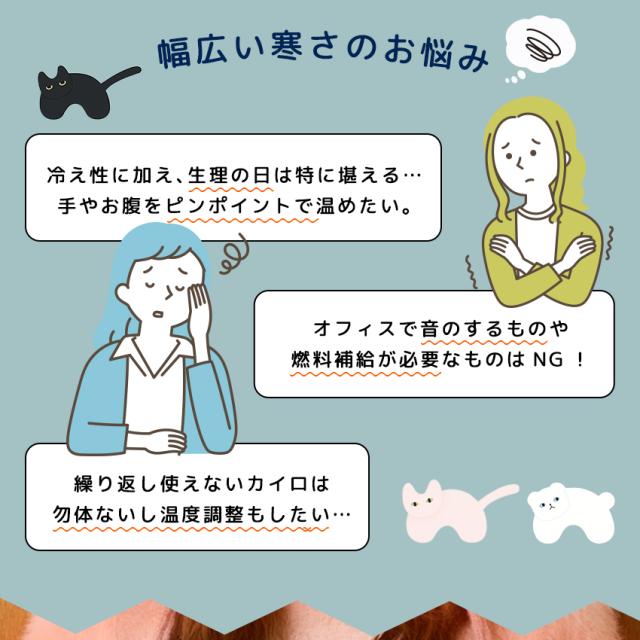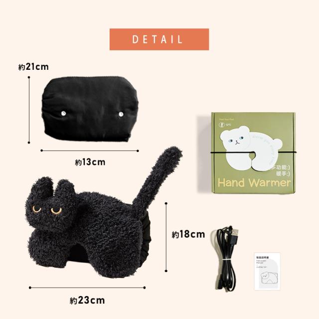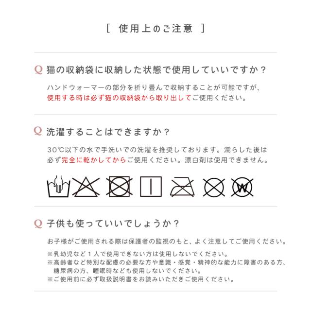 | ※モバイル充電器は付属しません。 ※海外製造品のため、箱や本体にキズ、汚れ、擦れなどがある場合がございますが、不良ではございません。あらかじめご了承ください。 ※デバイスやモニター設定によって、実物と異なる色に表示される場合がございます。 ※お子様がご使用される際は保護者の監視のもと、よく注意してご使用ください。 ※乳幼児など1人で使用できない方は使用しないでください。 ※高齢者など特別な配慮の必要な方や意識・感覚・精神的な能力に障害のある方、糖尿病の方、睡眠時なども使用しないでください。 ※ご使用前に必ず取扱説明書をお読みいただきご使用ください。 ※ハンドウォーマーの部分を折り畳んで収納することが可能ですが、使用する時は必ず猫の収納袋から取り出してご使用ください。 |