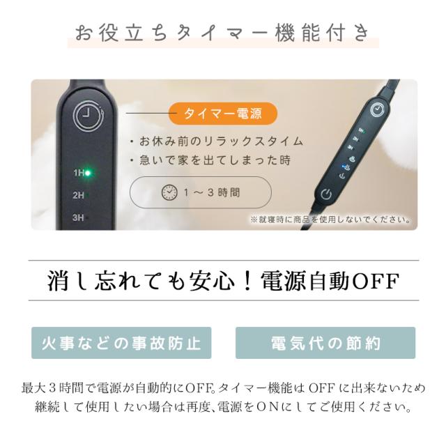 | 【タイマー機能】 嬉しいタイマー機能が付いているから、消し忘れても安心です。 1時間から、最大3時間で自動OFF。タイマー機能はOFFにできないため、 継続して使用したい場合は、再度電源をONにしてご使用ください。 |
