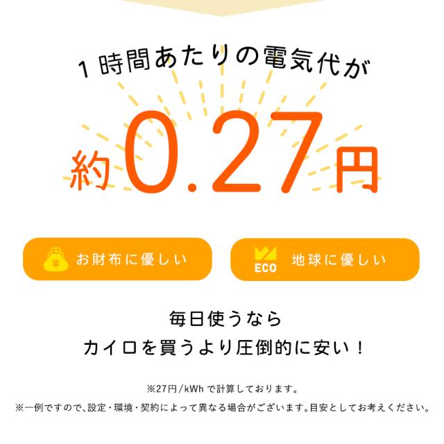| 【ECOでお財布に優しい】 電気代が安く済むから、毎日使うならカイロよりも安い! |