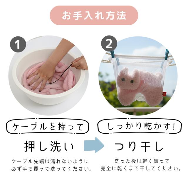 | 【お手入れ方法】 ケーブル先端は濡れないように必ず手で覆って押し洗いしてください。 洗った後は軽く絞って、必ず完全に乾くまで干してください。 |