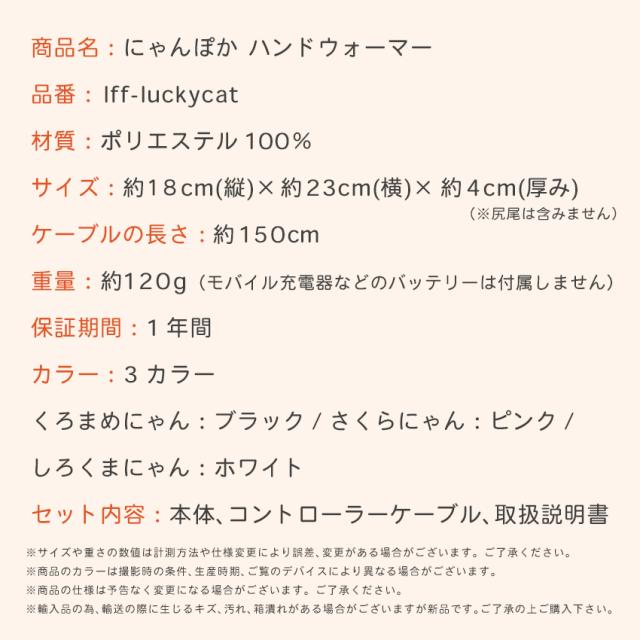 | 製品名:にゃんぽか 電熱ハンドウォーマー 品番:lff-luckycat サイズ(尻尾は含まない):約18cm(縦)×約23cm(横)×約4cm(厚み) 重量:約120g 品質保証:1年間 材質:ポリエステル 色:くろまめにゃん:ブラック・さくらにゃん:ピンク・しろくまにゃん:ホワイト 商品内容:本体1個/コントローラーケーブル1本/取扱説明書 |