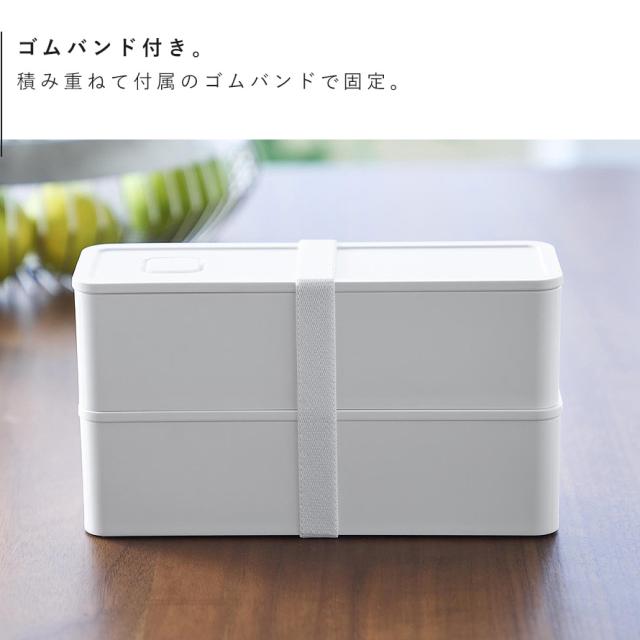 バルブをプッシュするだけで簡単に密閉できる、2段式のランチボックスです。積み重ねて付属のゴムバンドで固定。