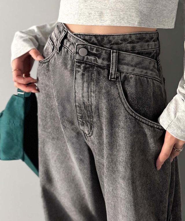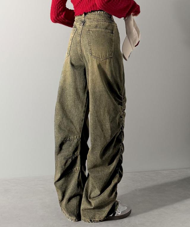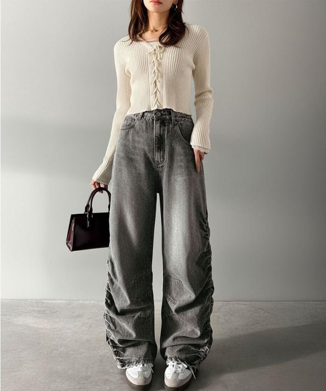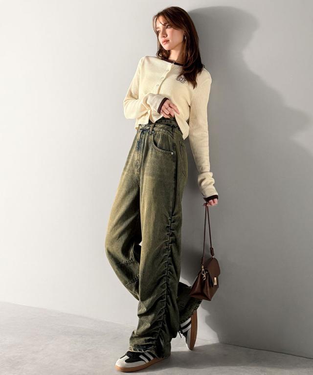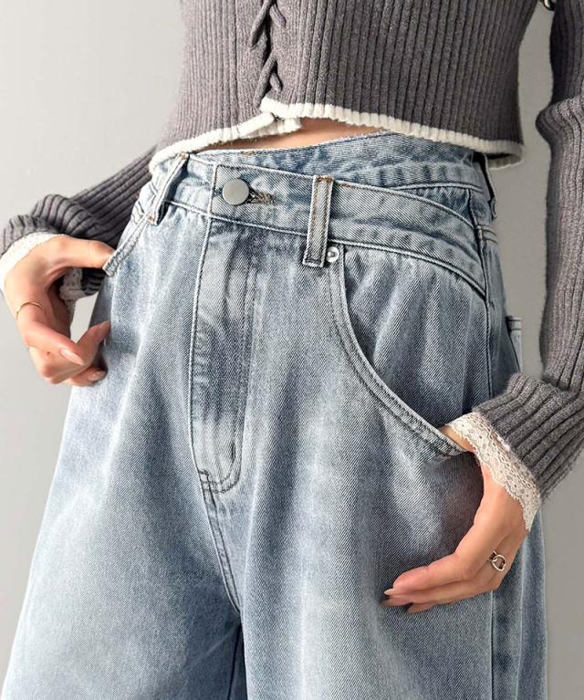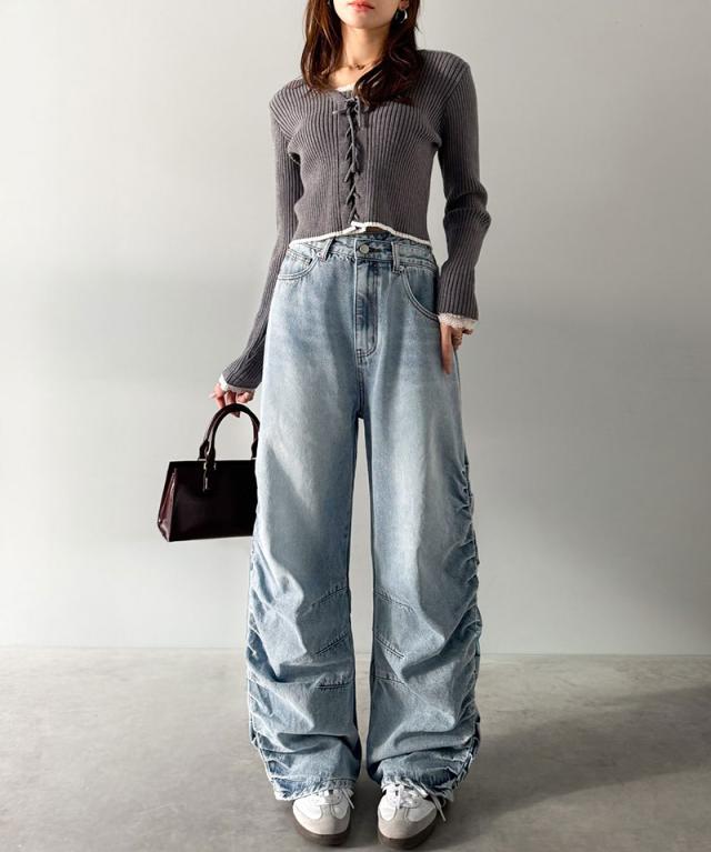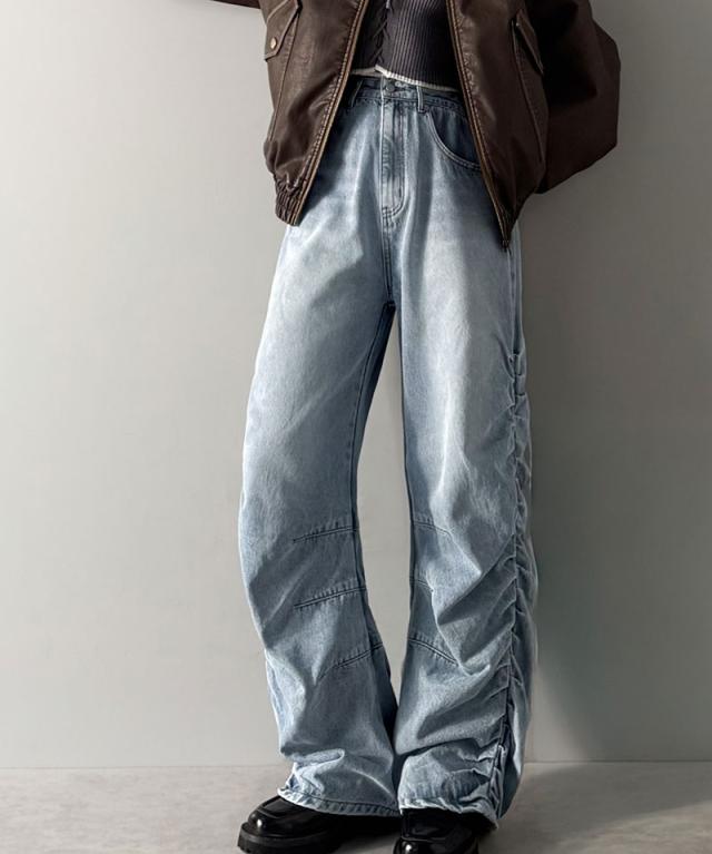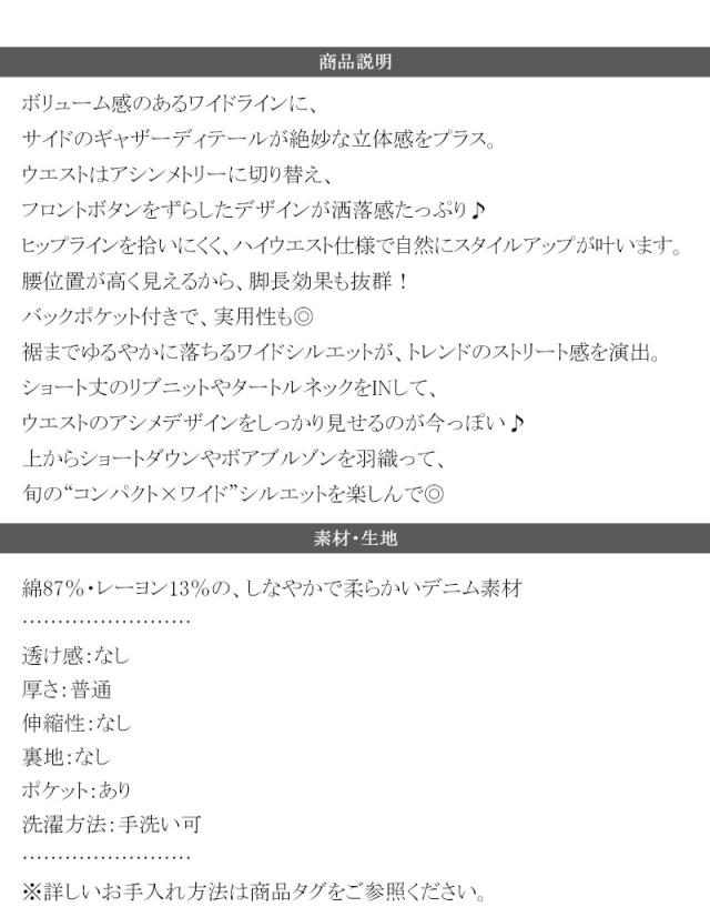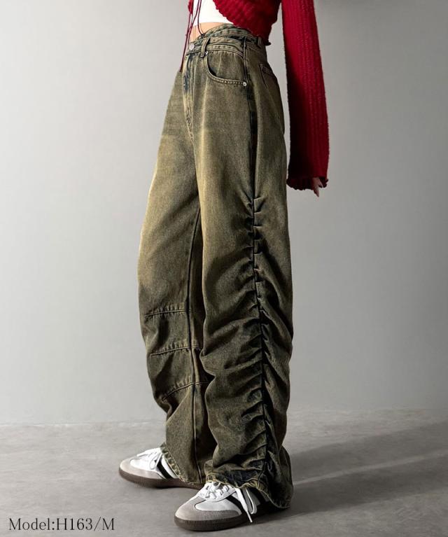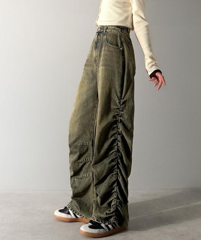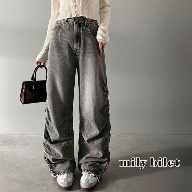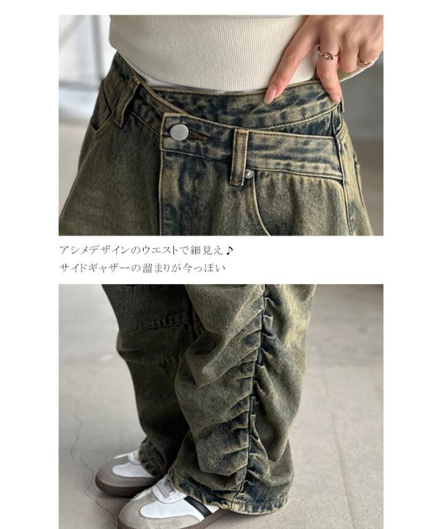 クラシカルエルフ冬新作 mily bilet ボトムス レディース デニムパンツ サイドギャザー ウエストアシメデザイン ルーズシルエット ロングシーズン 脚長見え ボリューム感 ハイウエスト 脚長効果 バックポケット付き ワイド 大きいサイズ 2025aw mi0909021