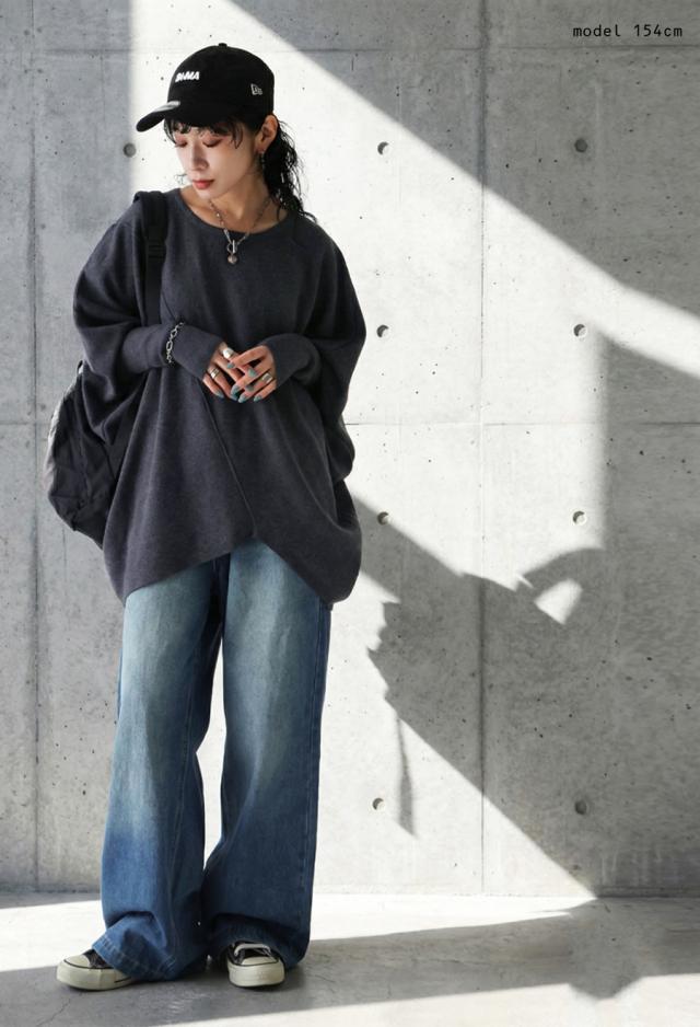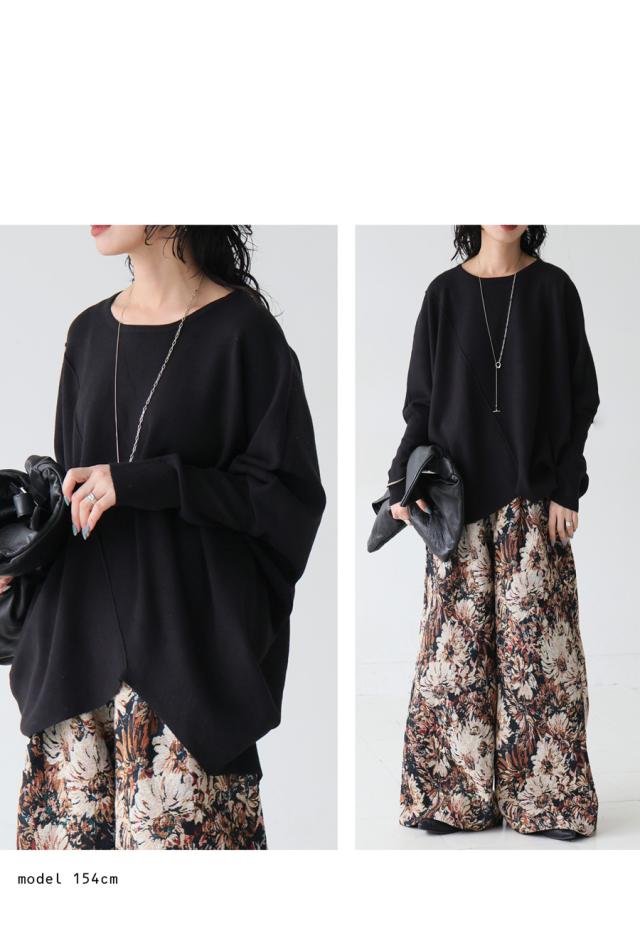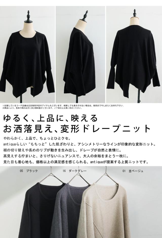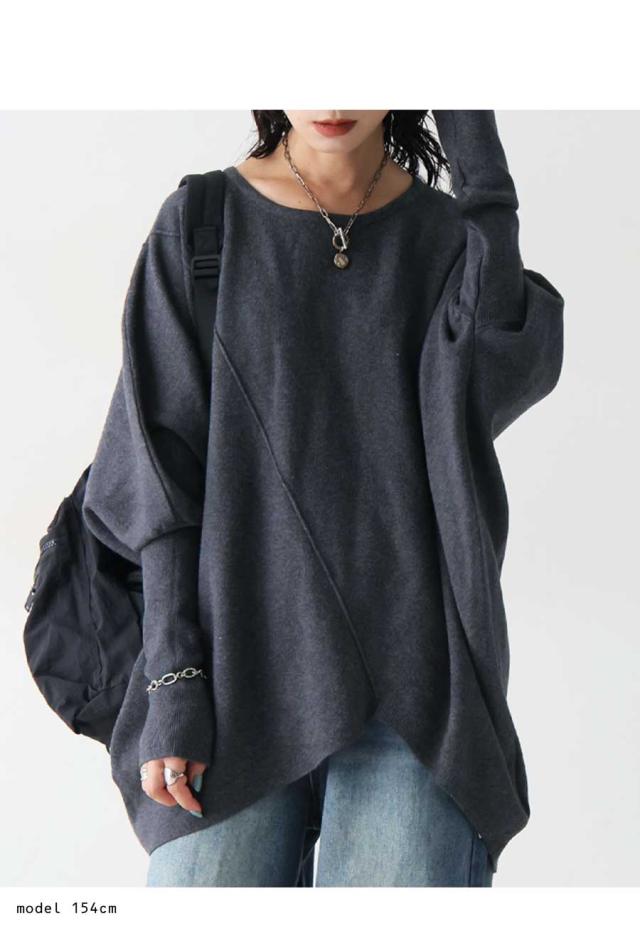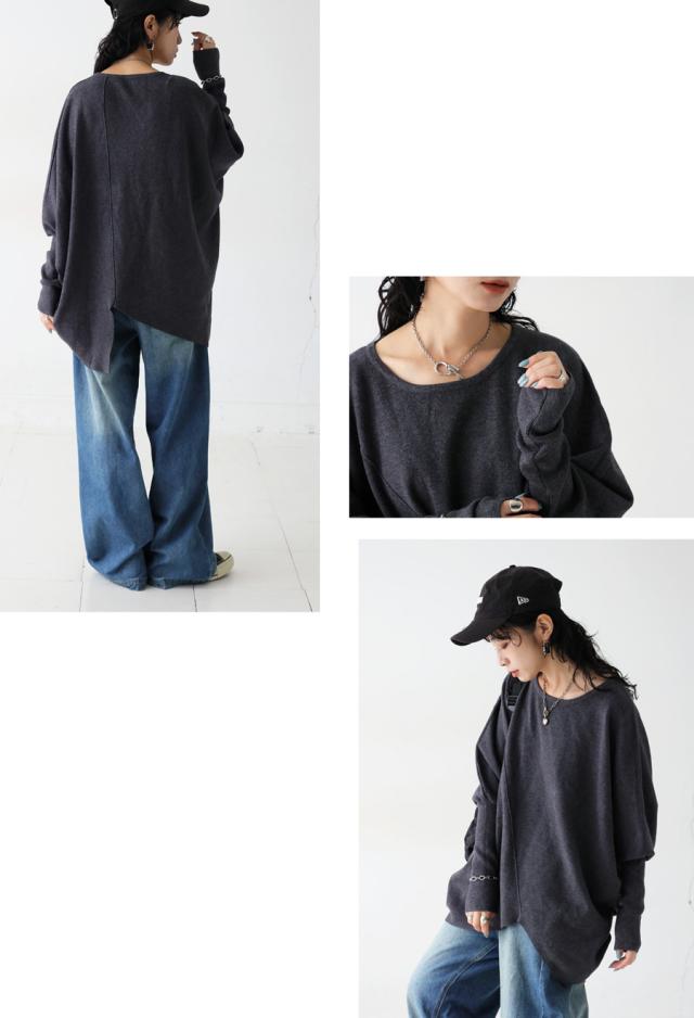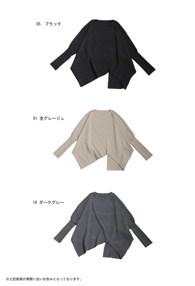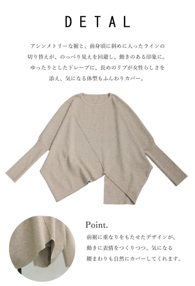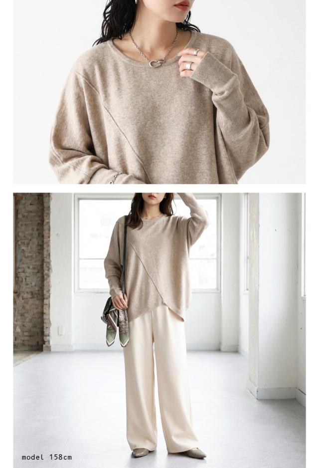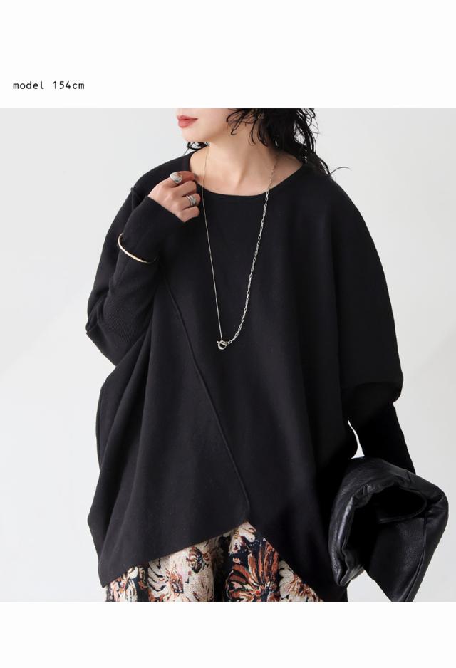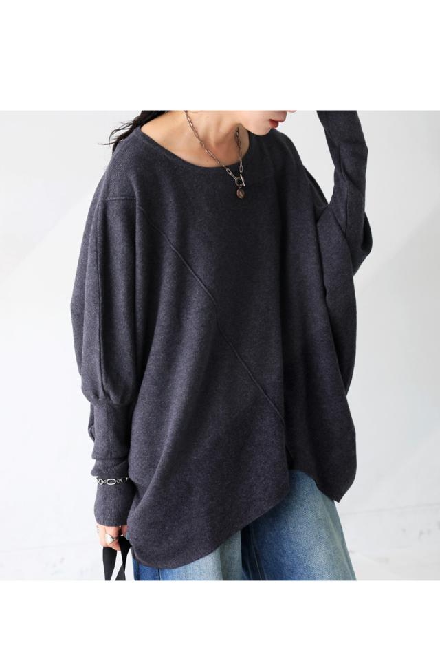 pks-00003 ニット セーター トップス 変形シルエット アシンメトリー アシメ ドレープ リブ袖 高級感 柔らかい ゆったり 体型カバー モード シンプル カジュアル きれいめ 無地 丸首