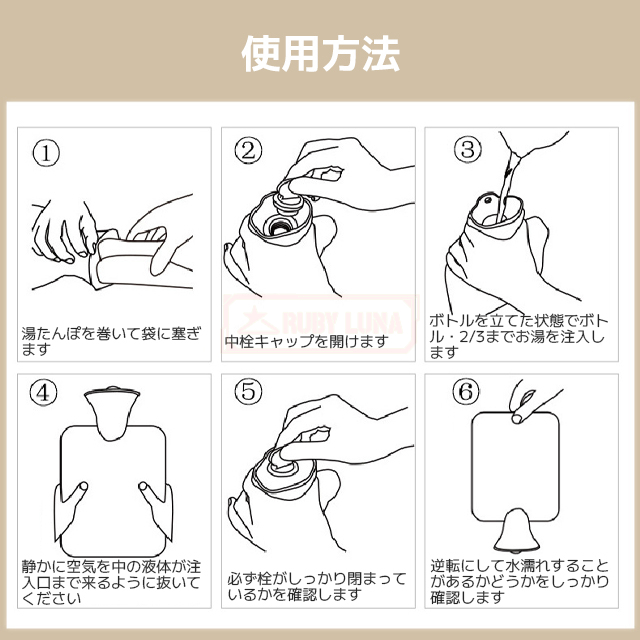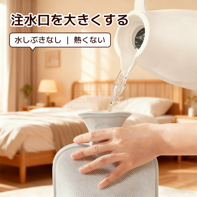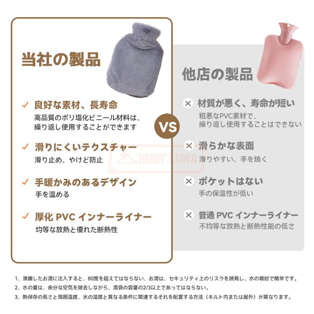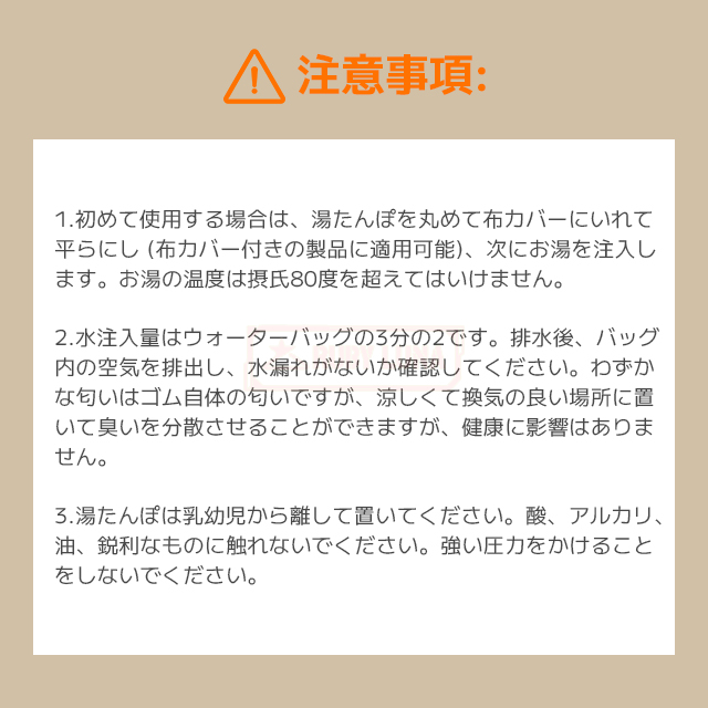 | 注意事項 | ◆1.初めて使用する場合は、湯たんぽを丸めて布カバーにいれて平らにし (布カバー付きの製品に適用可能)、次にお湯を注入します。お湯の温度は摂氏80度を超えてはいけません。 ◆2.水注入量はウォーターバッグの3分の2です。排水後、バッグ内の空気を排出し、水漏れがないか確認してください。わずかな匂いはゴム自体の匂いですが、涼しくて換気の良い場所に置いて臭いを分散させることができますが、健康に影響はありません。 ◆3.湯たんぽは乳幼児から離して置いてください。酸、アルカリ、油、鋭利なものに触れないでください。強い圧力をかけることをしないでください。 |