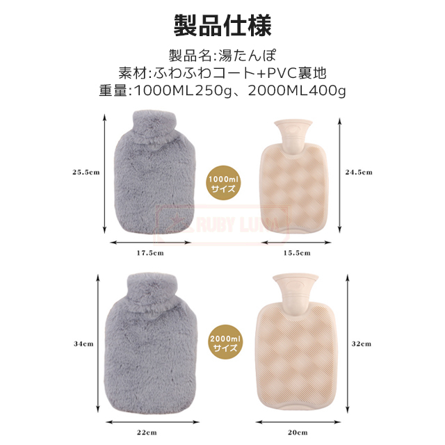| 【PVC素材】 | ◆PVC湯たんぽは折り畳めるほど柔らかく、非常に軽く、嫌な臭いもありません。 保温性に優れた生地なので、湯たんぽの温かさが長持ち! 熱水にも氷水にも対応しており、水漏れが全くありません。 季節を問わずお使いいただけます。 カバーは柔らかい素材を使用しており、心地よい暖かさを体験できます。 湯たんぽは全身を温め、筋肉痛、肩こり、腰痛、生理痛、関節炎、ストレスなどの治療に使用でき、発熱している子供の冷湿布としても使用でき、むくみを軽減するためにも使用できます。 軽傷のこと。 |
