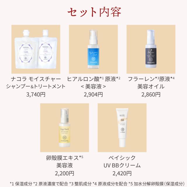 シャンプー&トリートメント、BBクリーム、美容液3種など、毎日のケアに嬉しいアイテムがたっぷり6点入り。