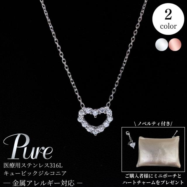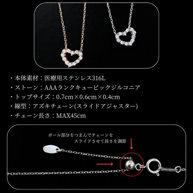 金属アレルギーを誘発しにくい、敏感肌に優しい最高位の医療用ステンレス316Lに、AAAクラスのキュービックジルコニアをあしらったハートネックレス。