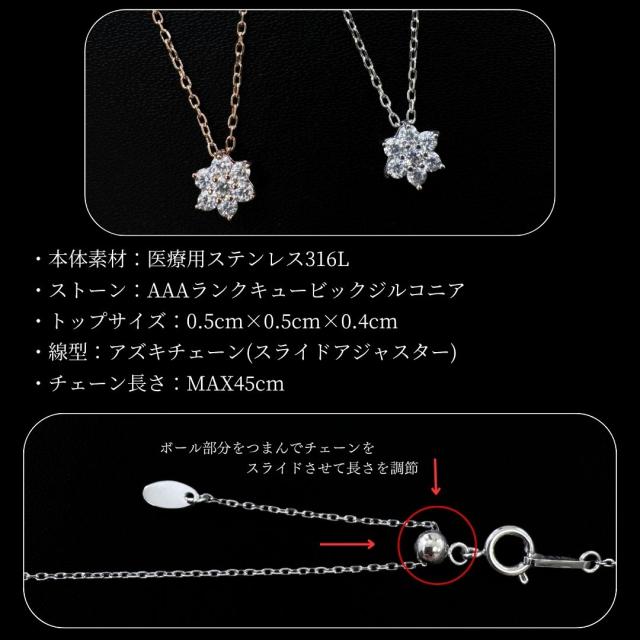 金属アレルギーを誘発しにくい、敏感肌に優しい最高位の医療用ステンレス316Lに、AAAクラスのキュービックジルコニアをあしらったフラワーネックレス。