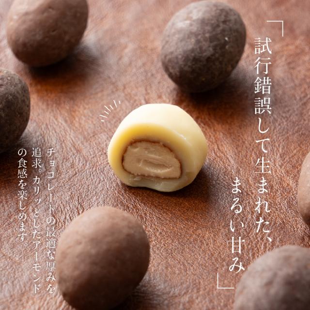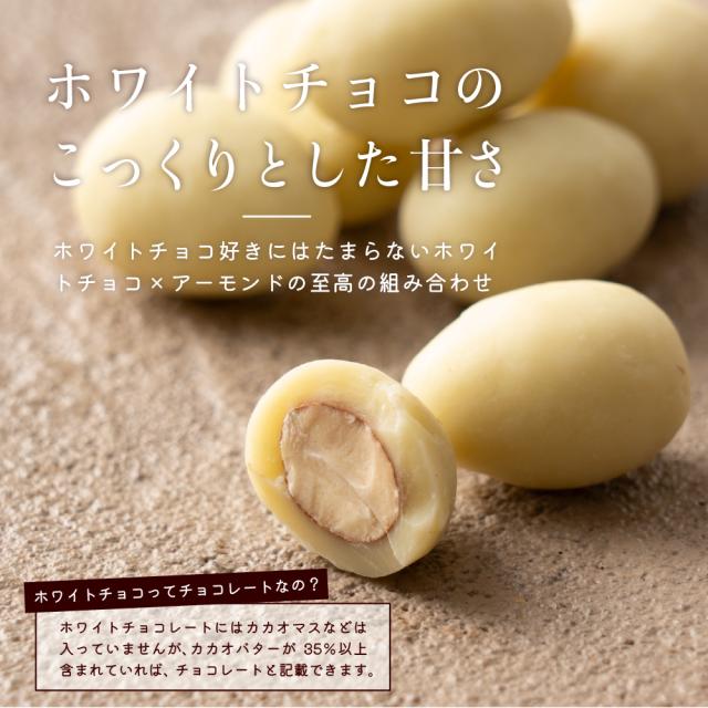 | ホワイトチョコレート 【原材料名】 ホワイトチョコレート(ココアバター、砂糖、全粉乳、脱脂粉乳)(国内製造)、アーモンド/乳化剤、香料(一部に乳成分・アーモンド・大豆を含む) 【栄養成分表示】 (100g当たり)※推定値 エネルギー:607kcal たんぱく質:12.9g 脂質:46.5g 炭水化物:36.8g 食塩相当量:0.32g |
