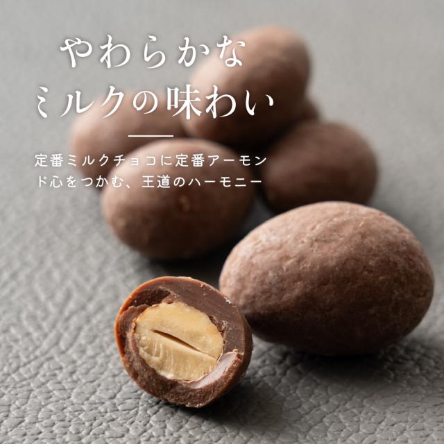 | ミルクアーモンド 【原材料名】 チョコレート(砂糖、全粉乳、ココアバター、カカオマス)(国内製造)、アーモンド/乳化剤、香料(一部に乳成分・アーモンド・大豆を含む) 【栄養成分表示】 (100g当たり)※推定値 エネルギー:589kcal たんぱく質:10.9g 脂質:42.8g 炭水化物:43.4g 食塩相当量:0.11g |