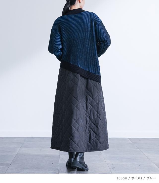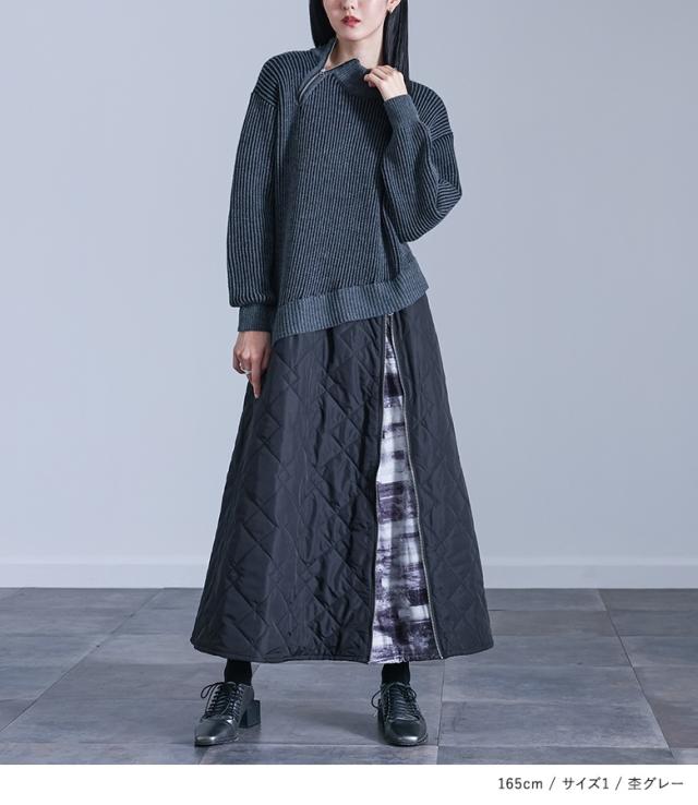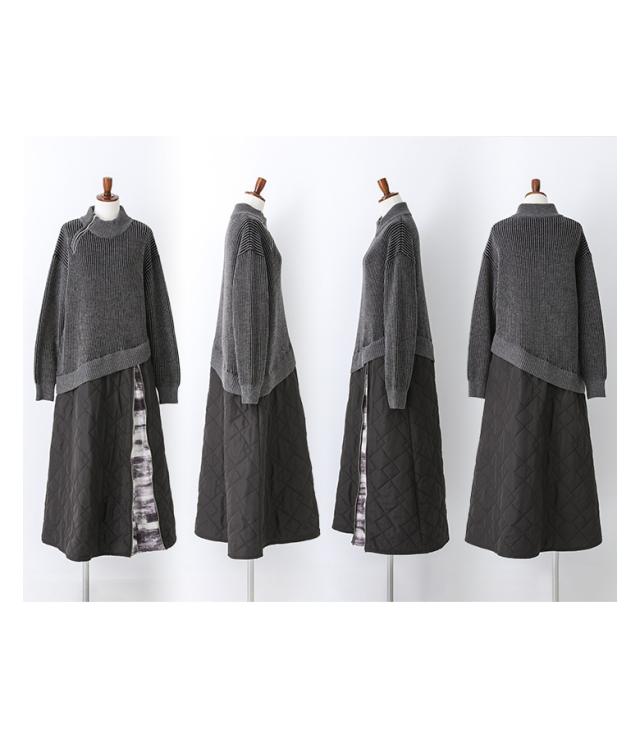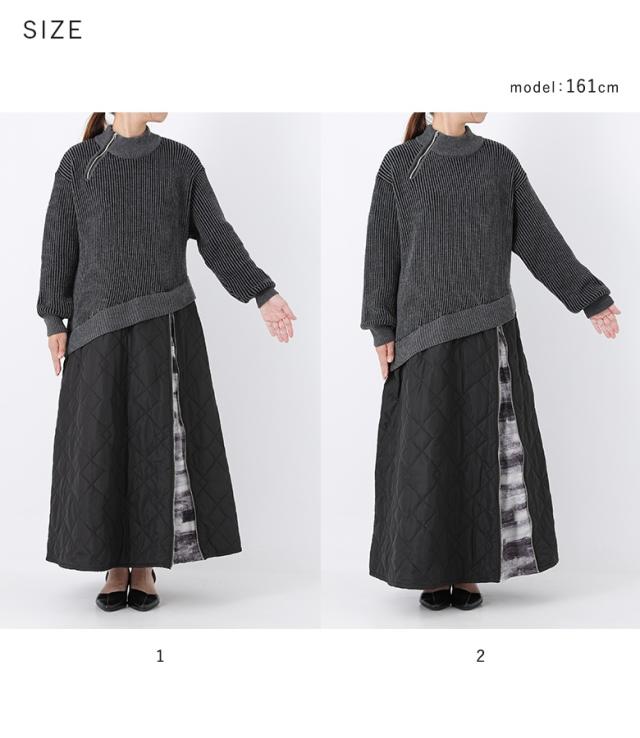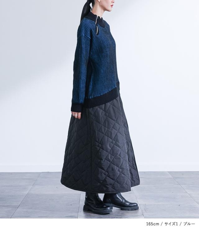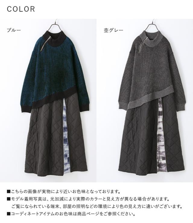 <冬新作>【送料無料】『キルティングドッキングニットワンピース』【メール便不可】【30】[ニットワンピース 長袖 レディース ワンピース ロング丈 異素材 アシンメトリー キルティング 配色 あったか 秋 冬]
