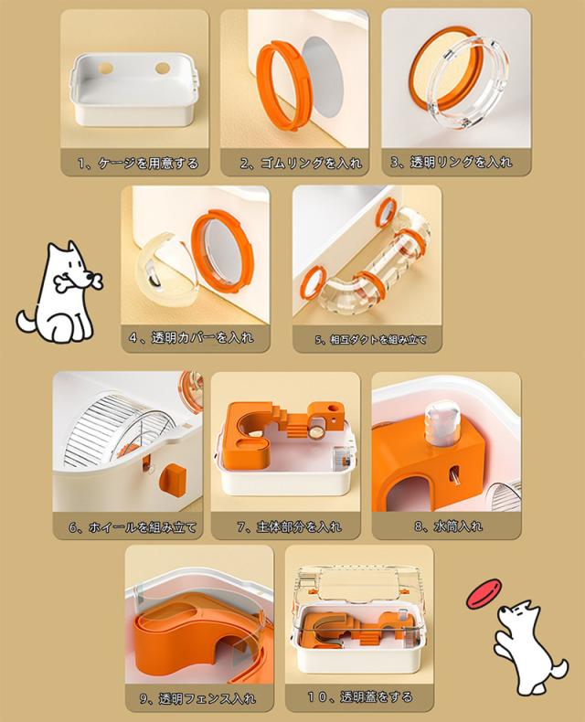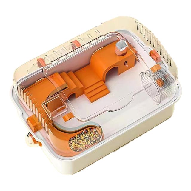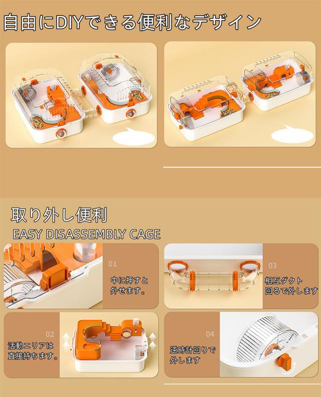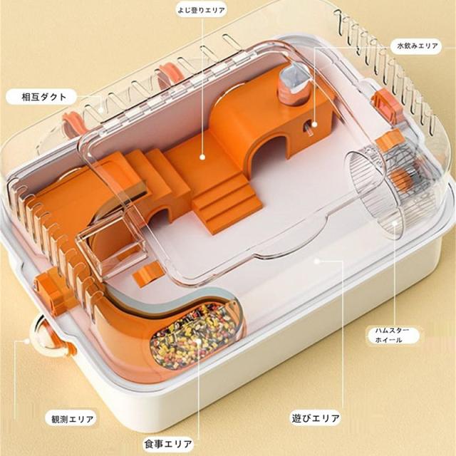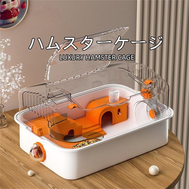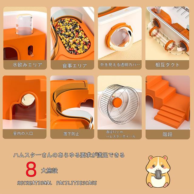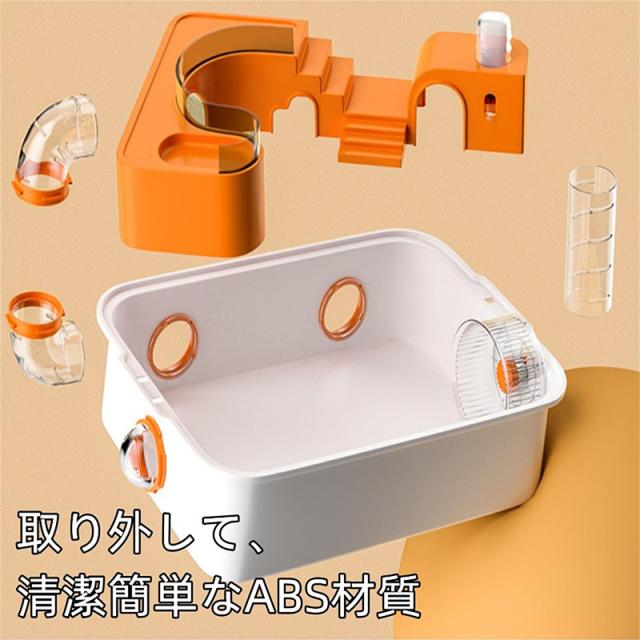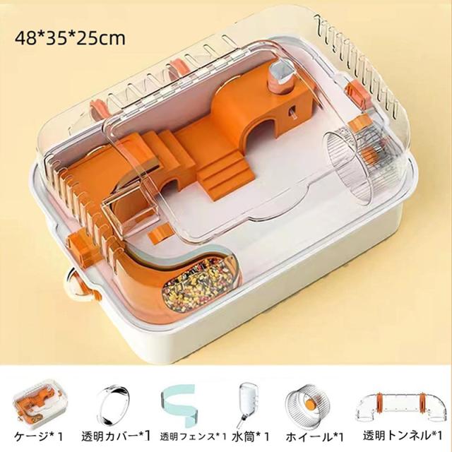 ハムスターケージ 小動物用ケージ 透明 DIY可能 ABS製 組立式 給水ボトルなど含めて7点セット 長さ48CM*幅35CM*高さ25CM 持ち運びやすい お掃除しやすい 通気穴いっぱい 華やかなオレンジ色 直径12cmホイール 風呂場付き