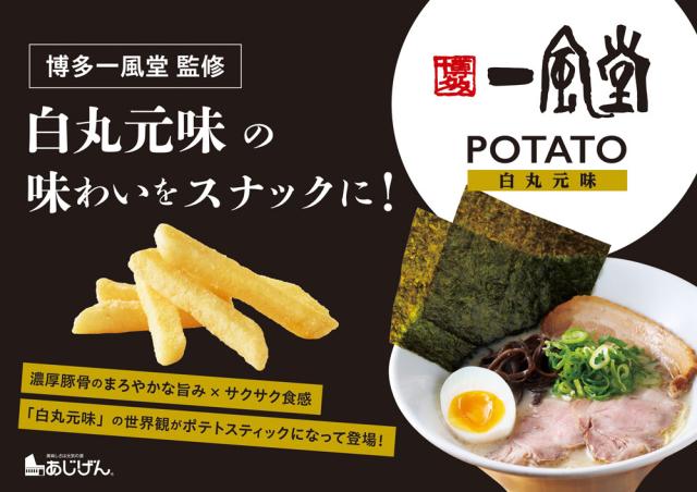 白丸元味:一風堂の博多豚骨ラーメンの原点「白丸元味」をポテトスティックで再現しました。ポテトと絶妙にマッチした白丸元味特有の豚骨本来の味を存分にお楽しみいただけます。