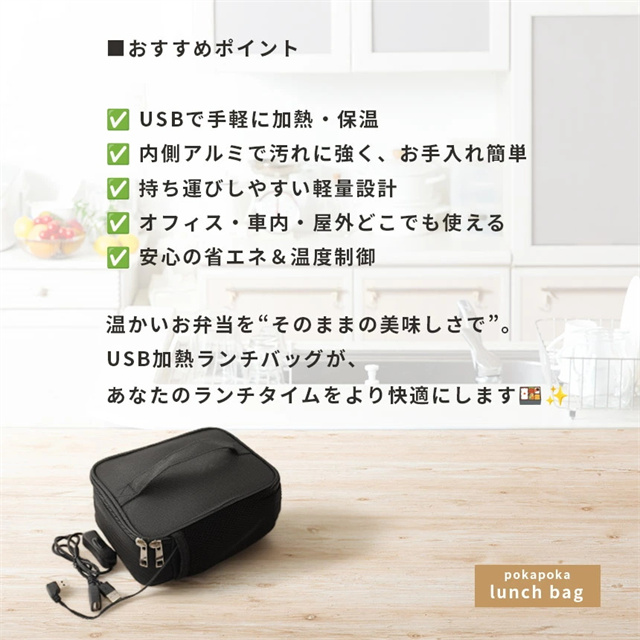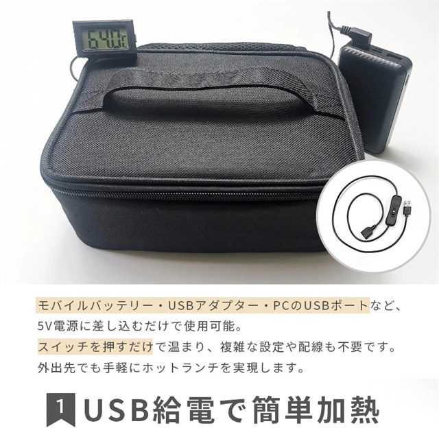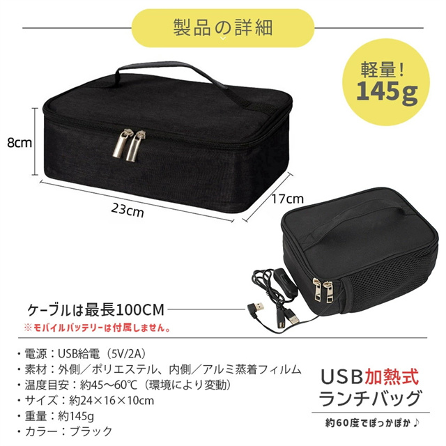 | 特徴 | 電子レンジがなくてもお弁当が温かい! このUSB加熱ランチバッグは、モバイルバッテリーなどにUSB接続するだけでバッグ内を加熱し、 食材を温めたり保温したりできる便利アイテムです。 寒い冬のオフィスランチやドライブ、現場作業などで大活躍。 どこでも“できたてのような温もり”を楽しめます。 ■USB給電で簡単加熱 モバイルバッテリー・USBアダプター・PCのUSBポートなど、5V電源に差し込むだけで使用可能。 スイッチを押すだけで温まり、複雑な設定や配線も不要です。 外出先でも手軽にホットランチを実現します。 ■効率的な加熱構造 バッグ内部の底面に配置された加熱プレートが、均一に熱を伝える構造。 お弁当箱全体をムラなく温め、ご飯やおかずの温かさをしっかりキープします。 通電後約10〜15分でほかほか温度に到達。 ■高品質アルミ内張り 内部は熱伝導と保温性に優れたアルミニウムフィルム素材を採用。 汚れが付いてもサッとひと拭きで清潔に保てます。 外側は耐久性の高いポリエステル生地で、軽くて持ち運びにも便利です。 ■コンパクトなのに大容量 サイズは約23×17×8cm。 お弁当箱、500mlペットボトル、スープジャーも入る広さで、収納力も抜群。 ランチ以外にも、飲み物や離乳食の保温ポーチとしても活躍します。 ■安全&省エネ設計 過熱を防ぐ温度制御機能付きで、長時間の使用でも安心。 消費電力が少なく、環境にも優しい省エネ仕様です。 |