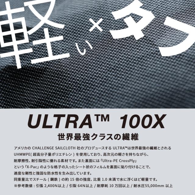 | 「UL04 UL BODY BAG─ULTRAが、日常をもっと身軽にする」 3L容量でスマホ・財布・鍵をスマートに収納。 止水ファスナーと高耐久素材“ULTRA™ 100X”で、雨の日もアクティブに。 What is ULTRA ? アメリカの CHALLENGE SAILCLOTH 社のプロデュースする ULTRA™は世界最強の繊維とされる UHMWPE( 超高分子量ポリエチレン ) を使用しており、高次元の軽さを持ちながら、耐摩擦性、耐引裂性に優れる素材です。また裏面には「Ultra-PE CrossPly」という「X-Pac」のような格子の入ったシート状のフィルムを裏面に貼り付けることで、適度な剛性と強固な防水性を生み出しています。同重量比でスチール ( 鋼鉄 ) の約 15 倍の強度、比重 1.0 未満で水に浮くほど軽量です。※参考数値 : 引張 2,400N以上 / 引裂 64N以上 / 耐摩耗 10 万回以上 / 耐水圧55,000mm 以上 |